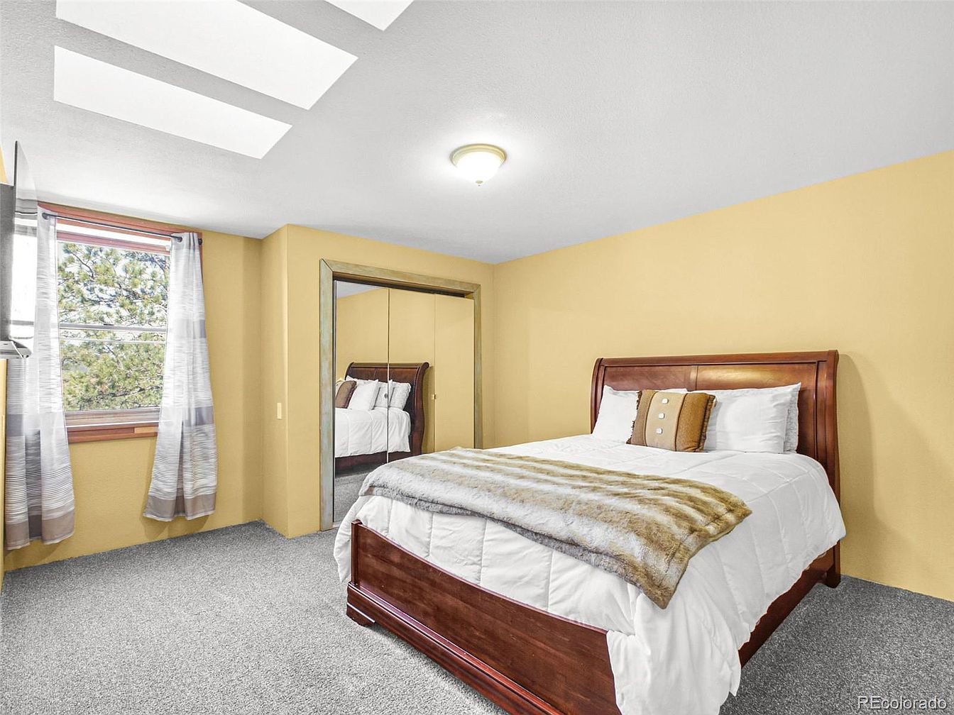 This bedroom features a warm, inviting palette with soft yellow walls and a plush light gray carpet that adds cozy texture underfoot. At its center stands a rich wooden sleigh bed dressed in crisp white bedding and accented by a fur throw and decorative pillows. Natural light floods the space through a window framed with sheer curtains, complementing the three skylights that brighten the room from above. A mirrored closet door beside the bed visually expands the space and adds practicality, while a simple ceiling light fixture provides functional illumination. The overall design balances comfort with clean, classic lines.