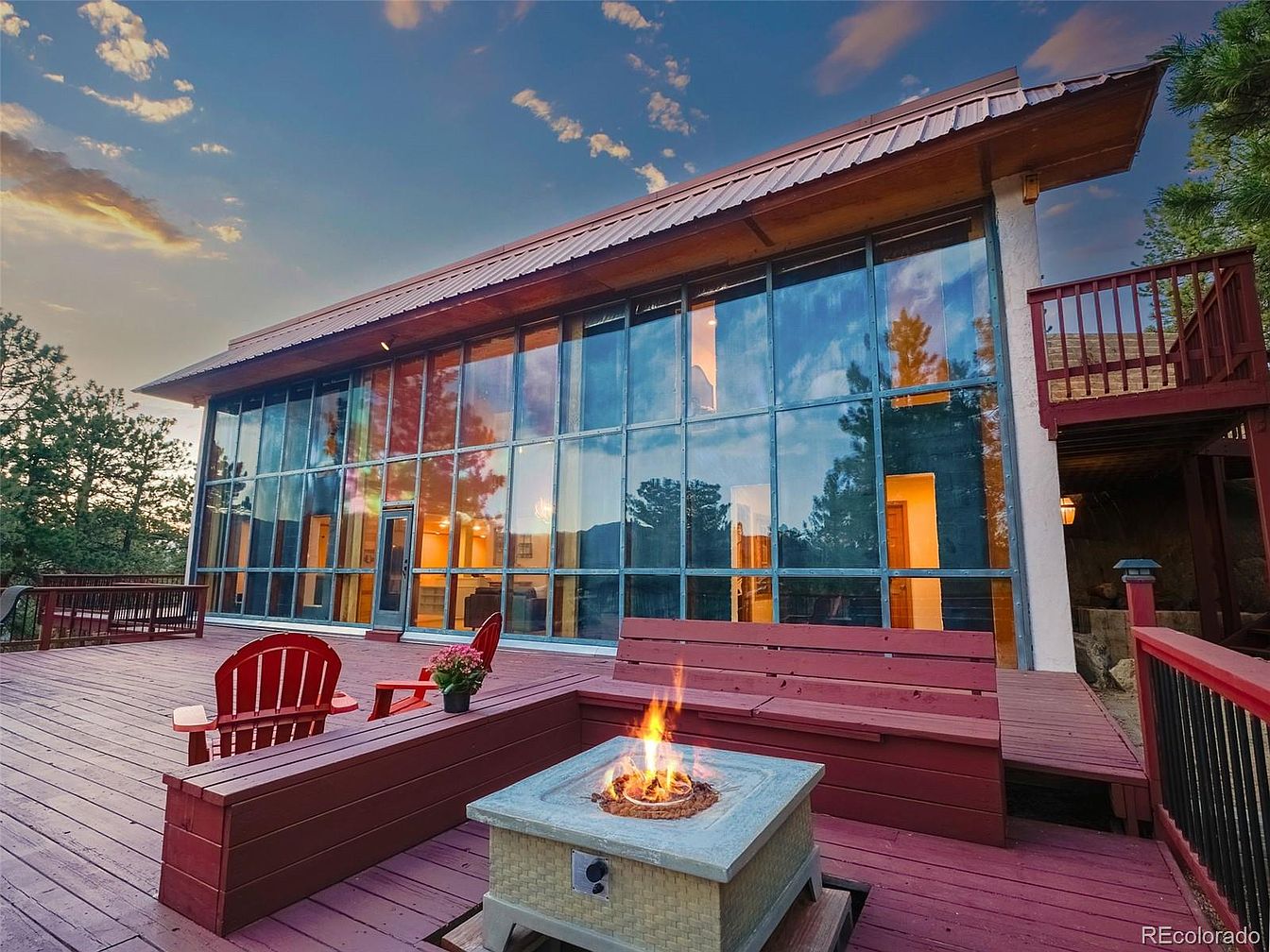 This expansive outdoor deck boasts a warm, reddish-brown wood finish that complements the surrounding natural environment of pine trees and rocky terrain. The deck features multiple seating areas, including a sunken conversation pit with a built-in fire pit, perfect for cozy gatherings. Adjacent to the deck is a striking floor-to-ceiling wall of glass windows that illuminates the interior living space while reflecting the scenic sunset and mountain views. The metal roof and clean architectural lines blend rustic charm and modern design, creating an inviting indoor-outdoor living experience in a tranquil forest setting.