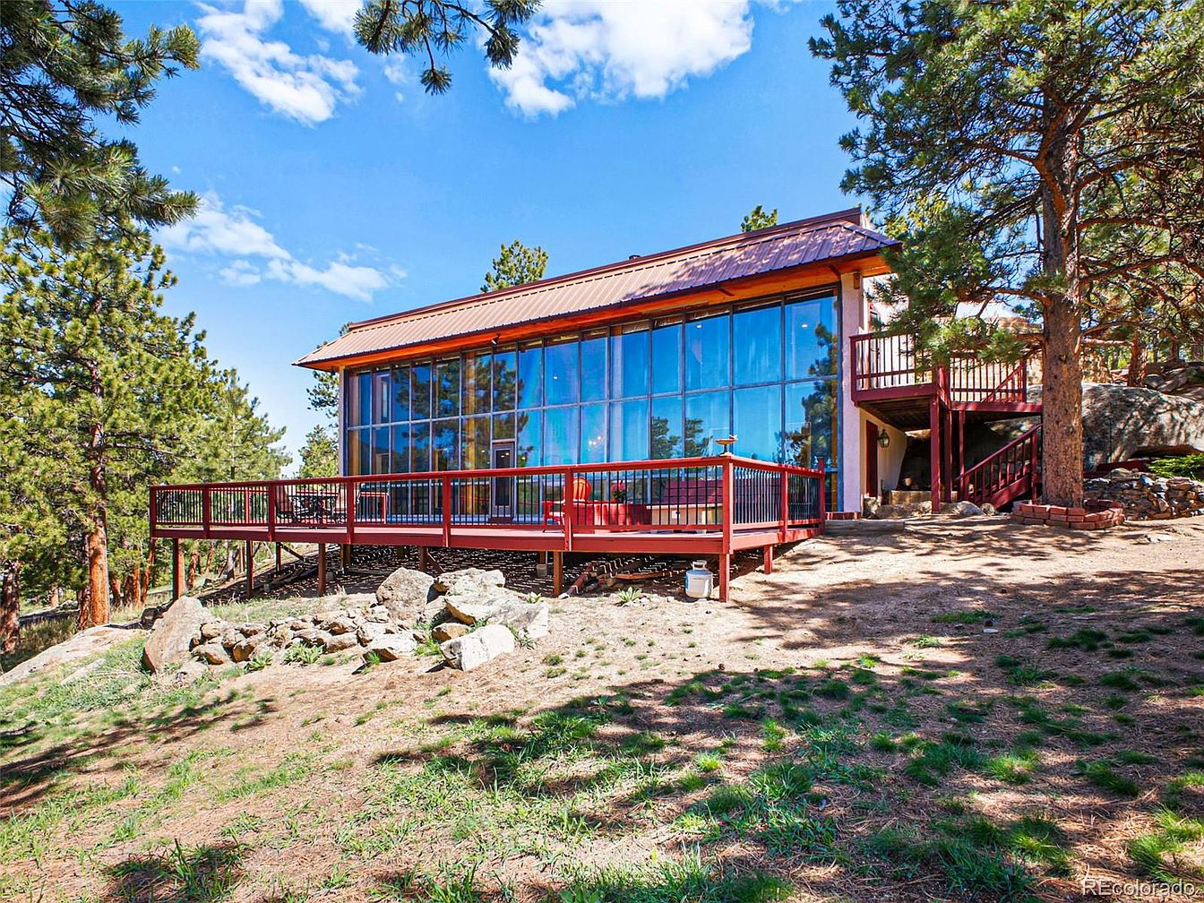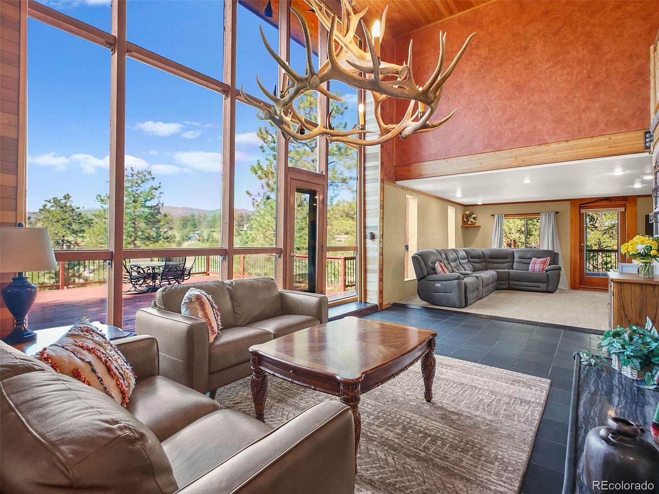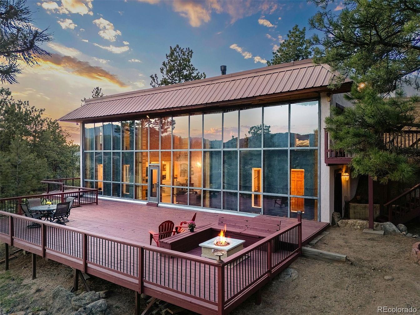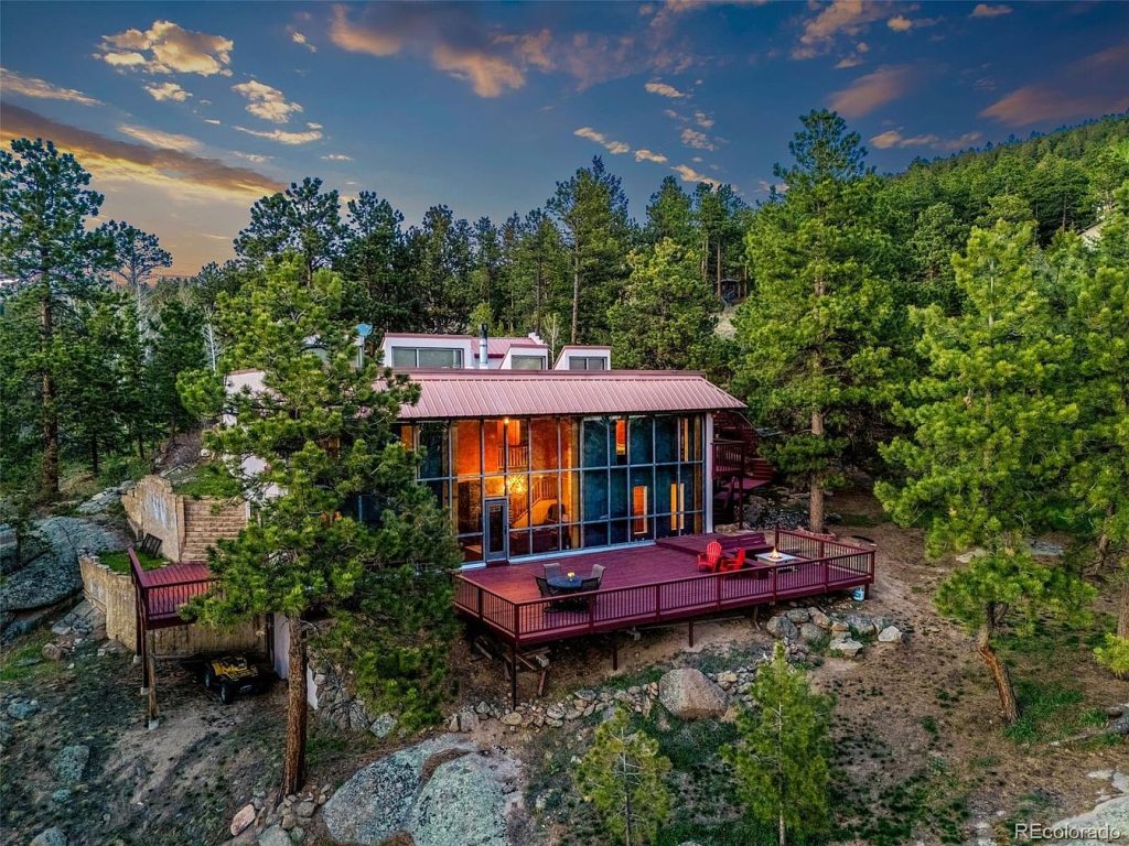 This stunning custom passive solar home is nestled on 2 pristine acres in the highly sought-after Evergreen Meadows community in Evergreen, Colorado. Boasting solid masonry construction with perfect earth and lot placement, this residence offers remarkable mountain views and impressive rock outcroppings, highlighting its harmonious integration with the natural surroundings. The architectural style showcases a modern approach to passive solar design, characterized by expansive floor-to-ceiling windows with automated power treatments that maximize natural light and energy efficiency, contributing to the owners’ remarkably low utility costs averaging just $108 per month. The home’s interior welcomes you with a large foyer leading to a great room featuring soaring ceilings, a large stone-surrounded wood-burning stove insert, and direct access to a spacious deck—ideal for relaxing or entertaining while enjoying the panoramic mountains and meadows. This unique and comfortable home offers a perfect blend of beauty, functionality, and sustainability, listed at a price of $885,000.