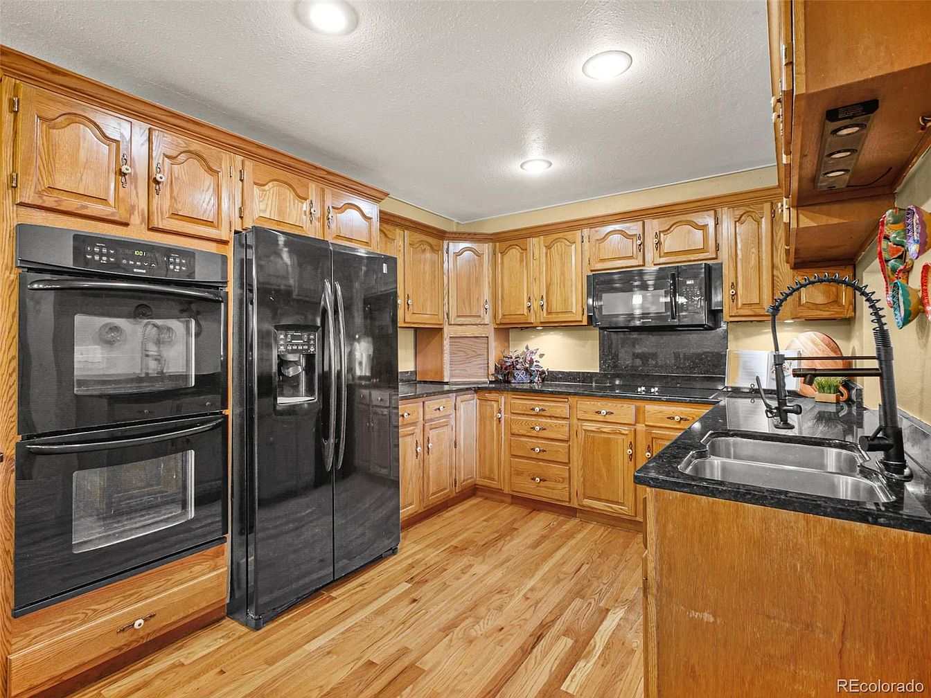 This kitchen is designed with warm wooden cabinetry that features raised panel doors and classic hardware, creating a cozy, traditional feel. The cabinetry extends along two walls, forming an efficient L-shaped workspace that maximizes storage and countertop area. Black appliances, including a double oven, side-by-side refrigerator, and built-in microwave, contrast sharply with the wood tones, complemented by matching black granite countertops and backsplash. The natural hardwood flooring ties the space together, while modern recessed lighting in a white ceiling provides bright, even illumination. A contemporary black spring coil faucet completes the sink area, blending functionality with style.