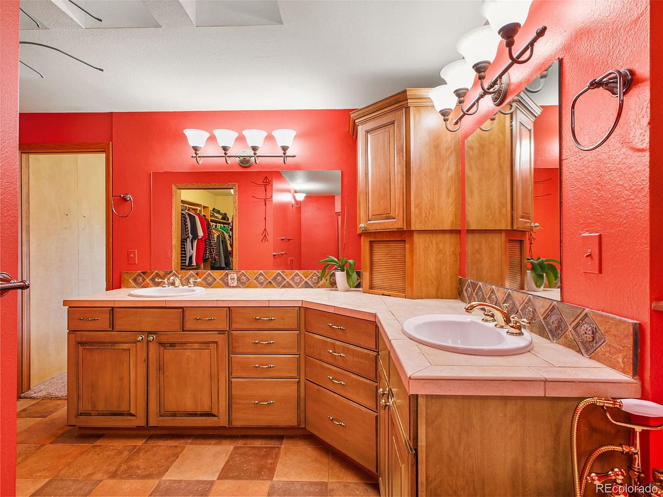 This bathroom features a spacious dual-sink vanity with a warm wooden finish that extends into ample cabinetry and drawers, providing generous storage. The countertop is tiled with neutral tones accented by decorative diamond-patterned backsplash tiles. Vibrant red walls bring energy and contrast to the space, complementing the wood and earthy floor tiles with varied shades. Above each sink are matching light fixtures with frosted glass shades, adding classic charm and balanced illumination. A large mirror spans the vanity, visually enlarging the room, and a walk-in closet is visible through the doorway, emphasizing practical use and convenience in the layout.