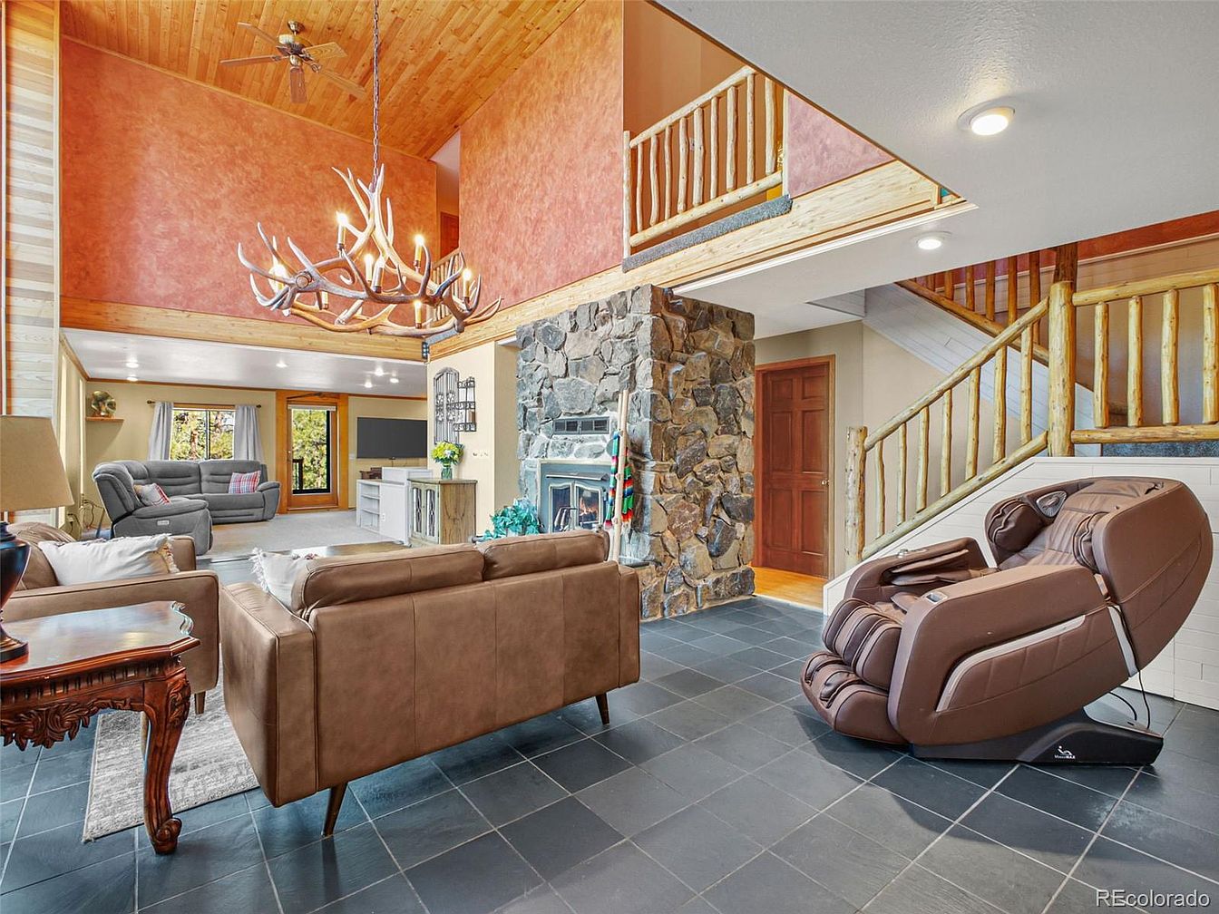This spacious living area blends rustic charm with modern comfort, featuring a floor of large slate tiles that add texture and durability. The space is anchored by a striking stone fireplace centerpiece with a natural, rugged look. Warm wood tones infuse the room with coziness, seen in the log-style staircase railing and the wooden ceiling overhead, complemented by an antler-inspired chandelier that enhances the lodge-like atmosphere. Furnishings include a sleek brown leather sofa and a cutting-edge massage chair, creating an inviting mix of traditional and contemporary relaxation zones. Large windows and open layout ensure ample natural light and connectivity with adjacent spaces.