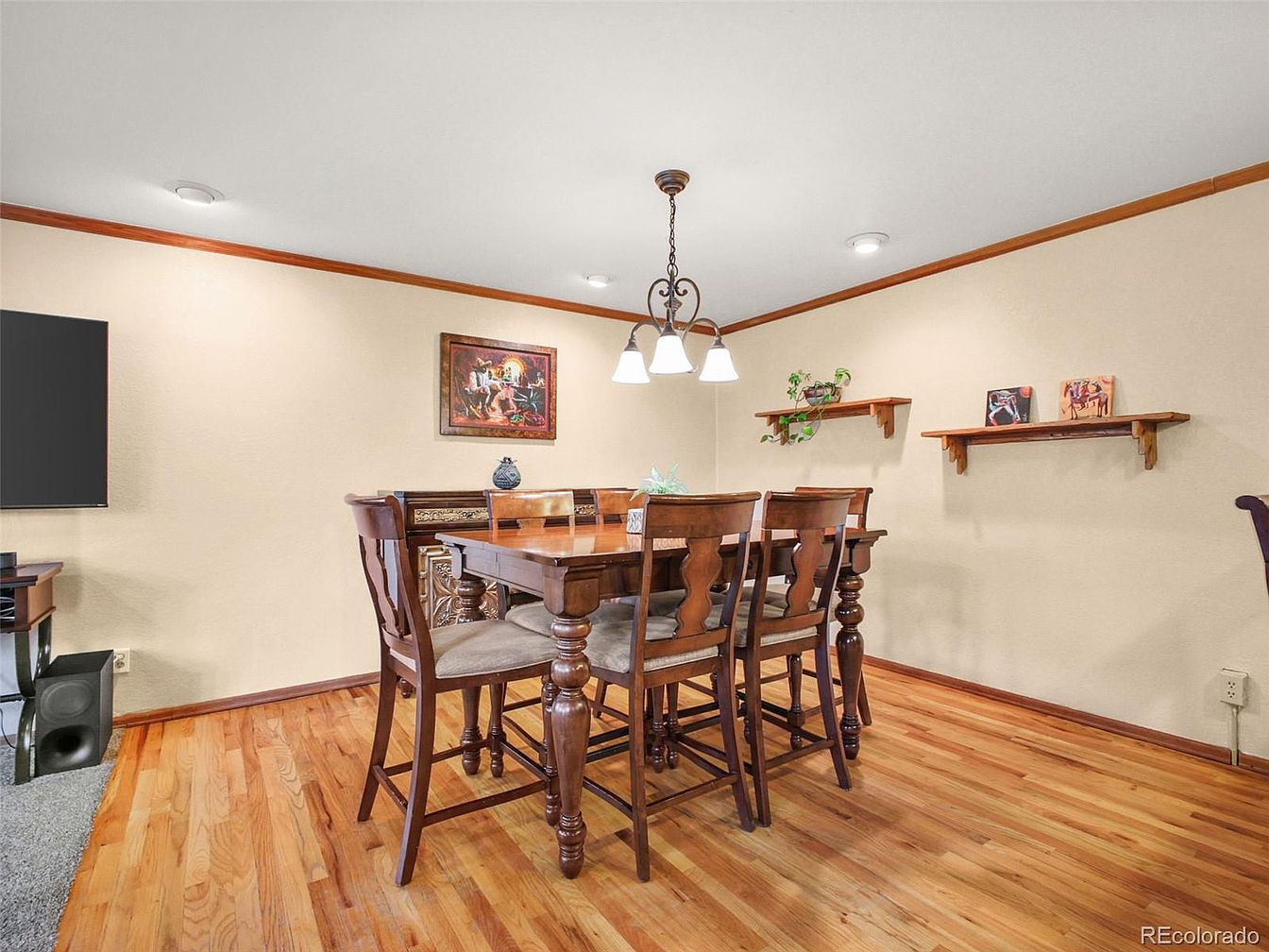 This cozy dining area features a rectangular wooden table with intricately turned legs paired with six matching chairs cushioned in neutral fabric. The room’s warm color palette is anchored by honey-toned hardwood floors, beige walls, and wood trim that highlights the ceiling perimeter. A wrought iron chandelier with three downward-facing frosted lights hangs centered above the table, adding a touch of classic charm. Two simple wooden shelves adorn one wall, decorated sparingly with small plants and artwork. Against the far wall, a carved wooden sideboard adds detail and functional storage, complementing the room’s traditional and inviting atmosphere.