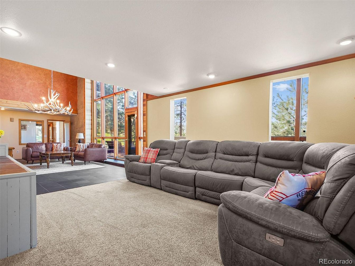 This family room offers a cozy and inviting space with a spacious, plush gray sectional sofa that dominates the seating area. The sofa features reclining sections and is accessorized with decorative throw pillows, adding warmth and comfort. The beige carpet contrasts softly with the darker gray upholstery, creating a balanced and neutral foundation. Along one wall, three evenly spaced, tall windows let in ample natural light and provide views of the surrounding greenery. The ceiling is plain white with recessed lighting, while the adjacent open area showcases a vaulted ceiling with rich wood tones, a dramatic antler chandelier, and leather seating, blending modern comfort with rustic charm.