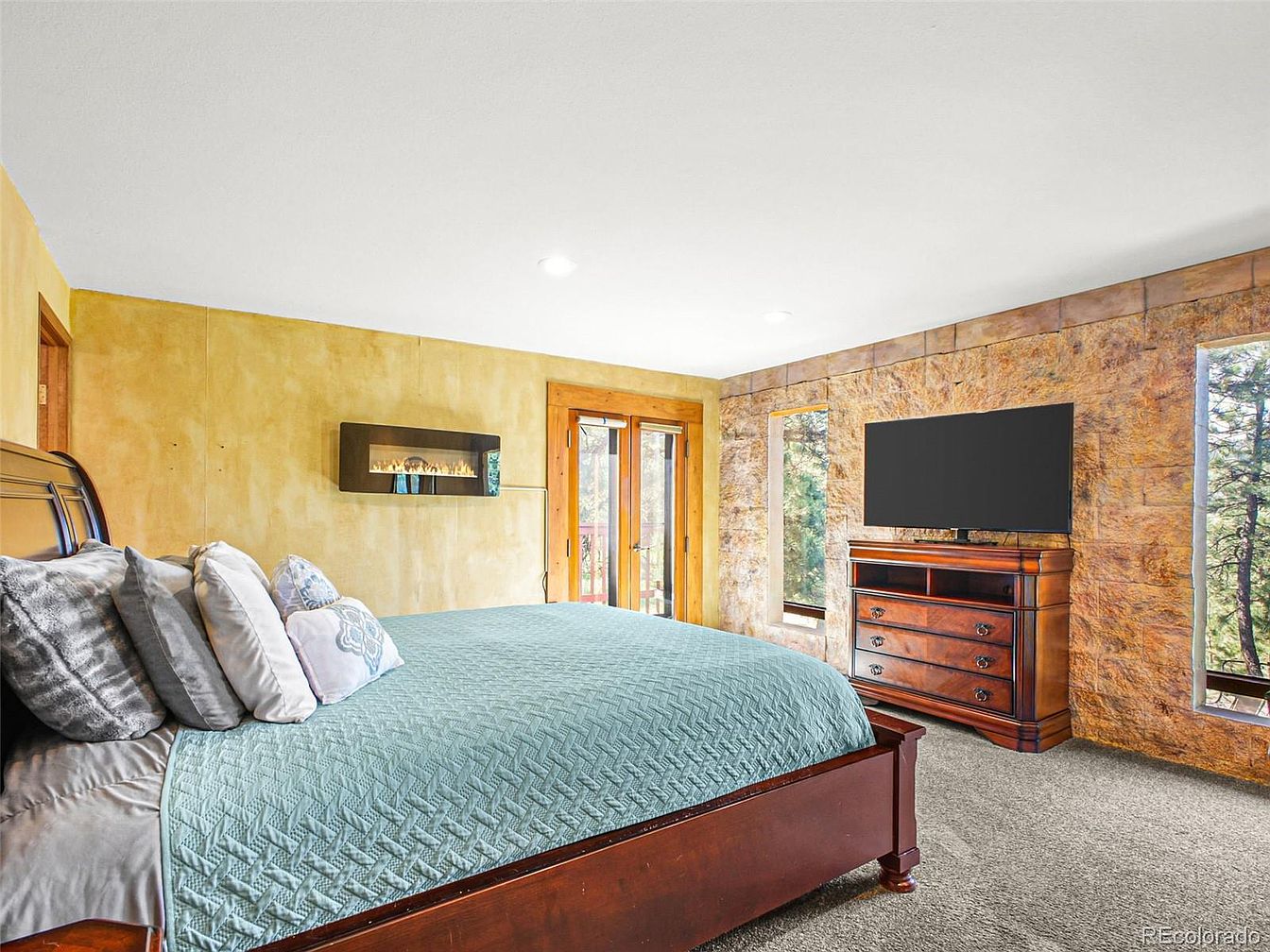 This master bedroom offers a warm and inviting atmosphere highlighted by textured stone accent walls and soft, neutral tones. The large wooden bed frame anchors the space, dressed in a muted aqua quilt with plush pillows that add comfort and subtle pattern. Opposite the bed, a classic wooden dresser supports a wall-mounted flat-screen TV, providing a blend of traditional and modern elements. Warm beige walls complement natural wooden trim and doors, which open to an outdoor balcony. An elongated modern wall fireplace adds ambiance, creating a cozy, peaceful retreat with nature views through tall windows.