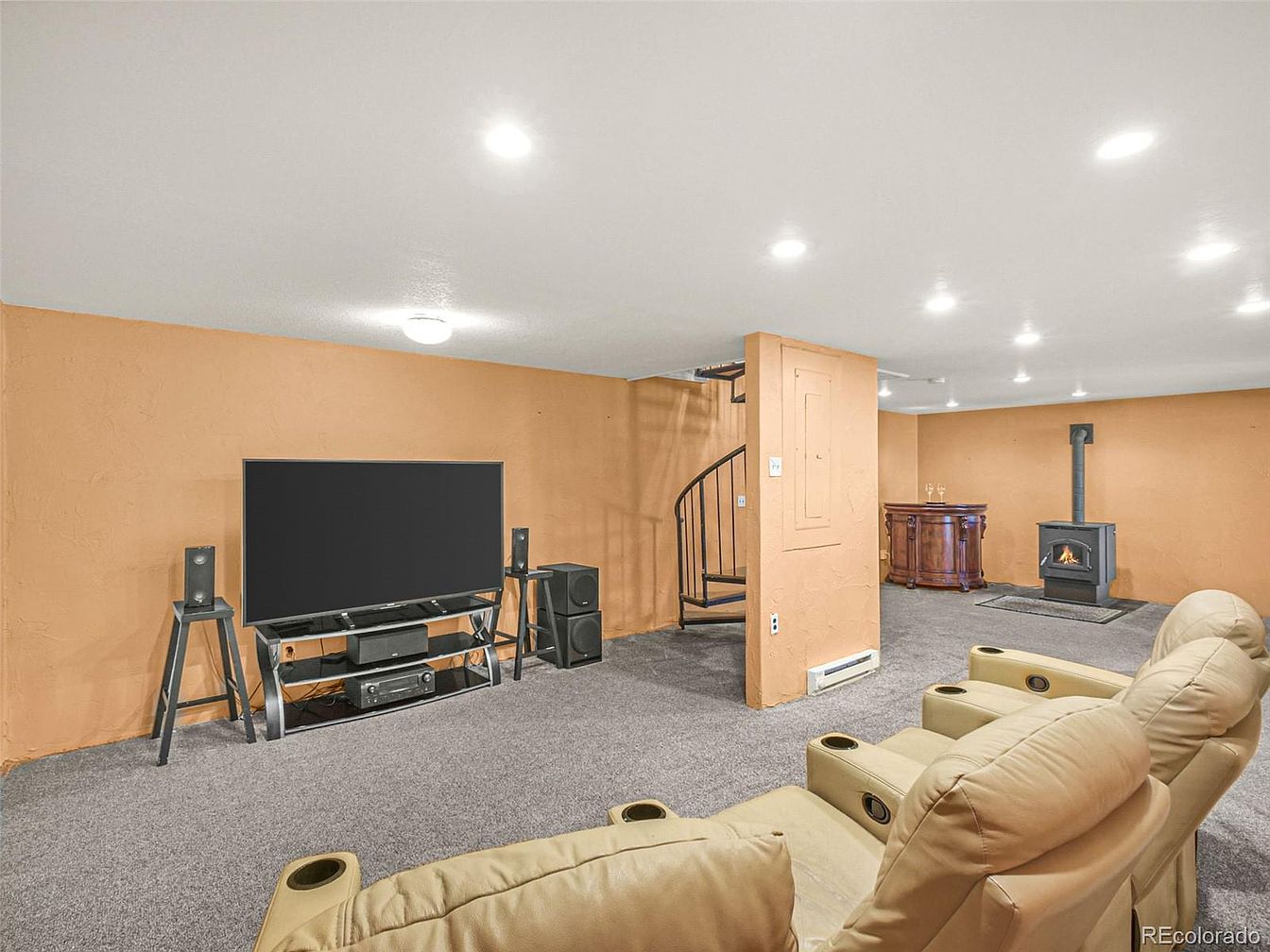 This cozy basement entertainment area features warm, orange-tinted walls contrasting with soft, gray carpeting that extends throughout the space. A modern home theater setup, including a large flat-screen TV with surrounding speakers on minimalist stands, anchors this entertainment zone. Plush beige reclining chairs with built-in cupholders provide seating with comfort and convenience. A black spiral staircase adds architectural interest and leads to the upper level. Against the far wall, a classic wood stove sits on a black hearth, flanked by a curved wooden cabinet, combining rustic charm with functional warmth. Recessed ceiling lighting brightens the inviting atmosphere.