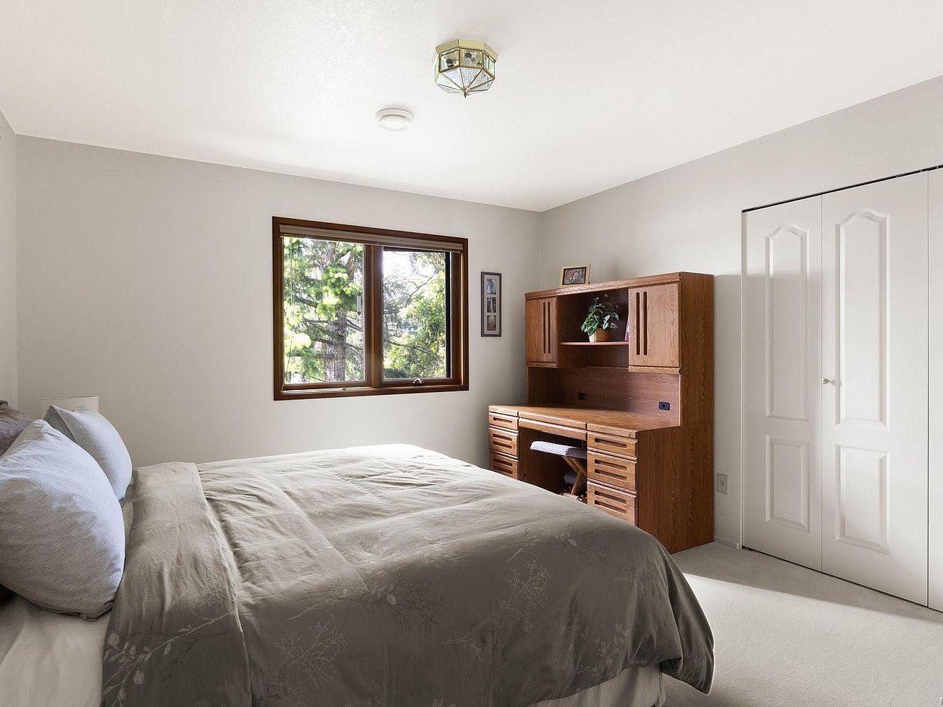 This bedroom features a neutral color palette with light beige walls and cream carpeting, creating a serene and calm atmosphere. Natural light streams through a wooden-framed window that overlooks lush greenery outside, adding warmth and connection to nature. The bed is dressed in coordinated soft gray bedding with subtle floral patterns, emphasizing comfort and simplicity. Positioned adjacent to the bed is a large wooden desk with multiple drawers and a hutch, providing a functional workspace with built-in storage. A small cushioned bench fits neatly under the desk. On the right, white double closet doors offer ample storage, rounding out this practical yet inviting personal space.