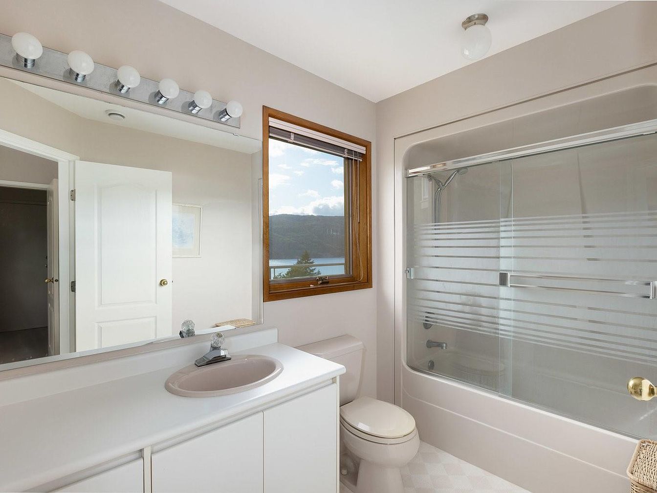 This bathroom features a clean, minimalist design with soft beige walls and white cabinetry. A large mirror stretches across the vanity, topped with a row of globe-style light bulbs that provide bright, even illumination. The countertop is white, paired with a light beige sink that complements the neutral palette. Natural light floods in from a window framed in warm wood trim overlooking a scenic water and mountain view, adding tranquility. The bathtub includes sliding glass doors with frosted horizontal stripes, combining functionality and style while maintaining a bright, airy atmosphere throughout the space.