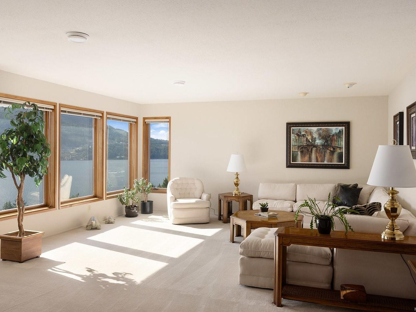 This spacious living room offers an inviting seating area anchored by a large, cream-colored sectional sofa and a matching armchair positioned near a corner of expansive windows. The natural wood trim on the windows enhances the warm, neutral palette, blending beautifully with beige walls and carpeted floors. Ample daylight floods the room, creating a bright, airy atmosphere while offering stunning views of a serene lake and surrounding hills. Dark wood furniture, including a console table, coffee table, and side tables, complements the soft upholstery, paired with brass-accented lamps and lush green plants to add warmth and texture. A framed landscape painting above the sofa ties the design together.