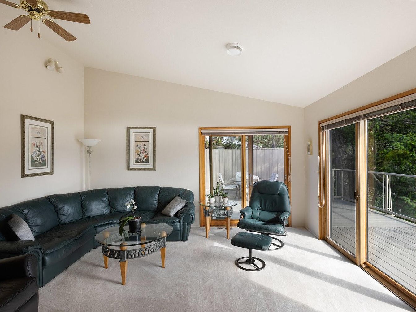 This living room features a spacious layout with a large L-shaped dark green leather sectional sofa and a matching reclining chair with an ottoman, both positioned to face the room’s focal point. The seating is complemented by a round glass coffee table with wooden legs and a side table holding small potted plants that add a touch of nature indoors. Soft neutral walls provide a calming backdrop for two framed floral prints. Carpeted flooring enhances comfort, while abundant natural light streams through large sliding glass doors with wooden trim, extending the space visually to an outdoor deck surrounded by greenery.