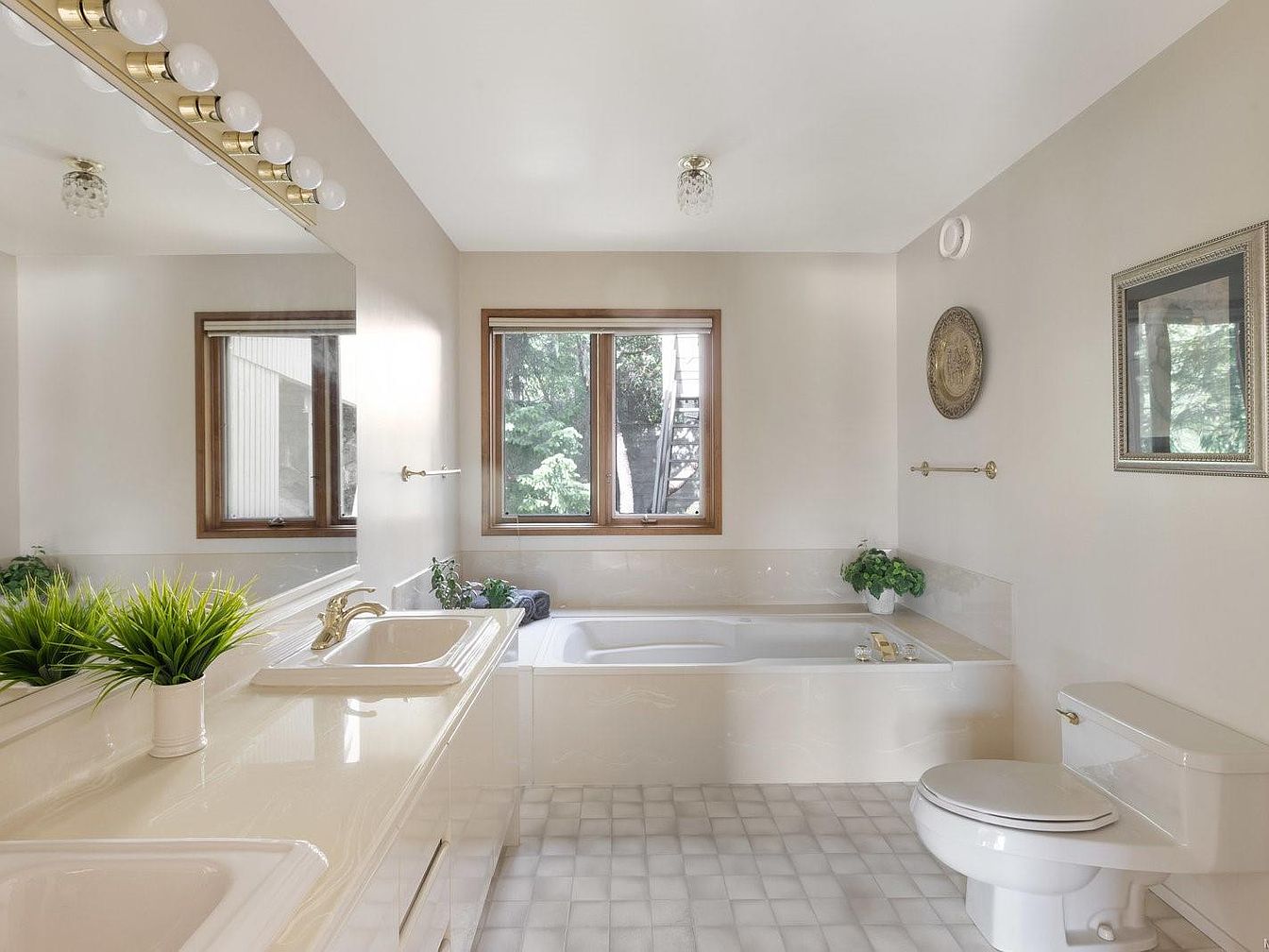 This bathroom exudes a clean, serene atmosphere with its light neutral tones. The layout includes a spacious built-in bathtub beneath a large window framed in natural wood, allowing ample daylight and providing a calming view of greenery outside. A long, glossy cream-colored vanity countertop with twin sinks and gold faucet fixtures stretches along one wall, complemented by a broad mirror featuring soft globe lights overhead. The floor is adorned with subtle checkered tiles in pale shades, adding understated texture. Decorative touches like green potted plants, a round hanging wall plate, and framed artwork enhance warmth and character in the spacious, well-lit space.