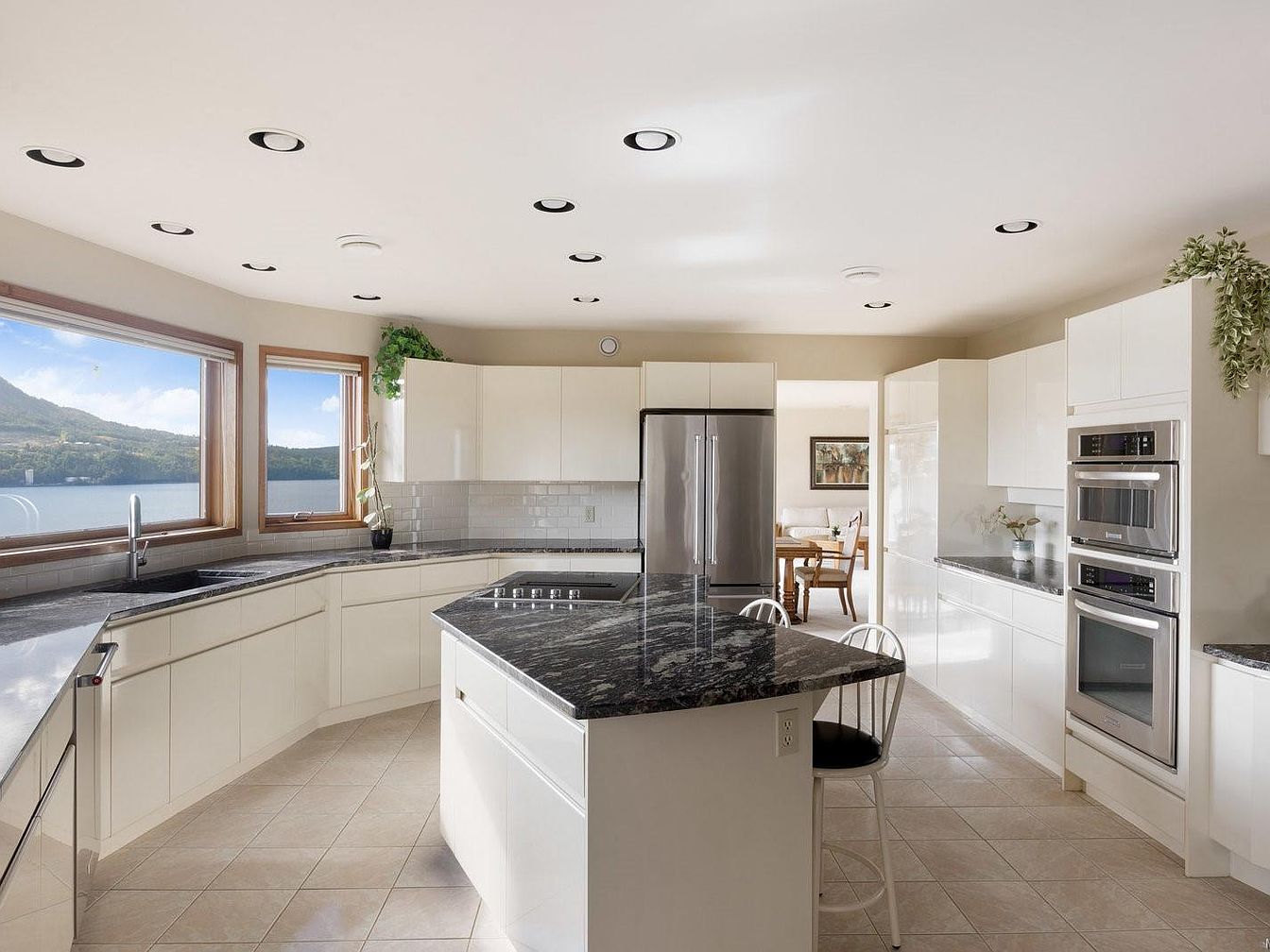 Spacious and bright, this kitchen features a clean, modern design characterized by glossy white cabinetry and sleek black granite countertops. An island in the center provides extra workspace and seating, with a built-in stovetop and a single black-cushioned chair. The L-shaped layout maximizes the room’s efficiency, complemented by a set of stainless steel appliances including a double oven and a large refrigerator. Light beige tile flooring adds warmth, while recessed lighting fixtures create an evenly illuminated environment. Large windows offer stunning natural views of surrounding hills and water, enhancing the room’s airy, inviting ambiance.