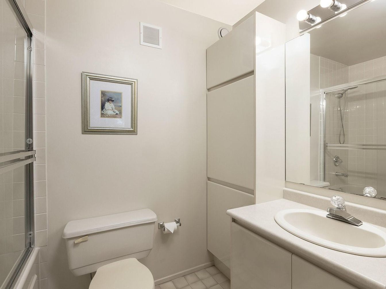 This compact bathroom includes a white toilet positioned against a neutral, pale wall adorned with a framed portrait above. Adjacent to the toilet is a flush-fitting tall white cabinet providing discreet storage. The sink counter is a matching white with a smooth surface, paired with a modest oval basin and a single-lever faucet. A large mirror spans the wall above the sink, flanked by simple vanity lights. The shower area, enclosed with sliding glass doors, reveals white tiled walls and chrome fixtures, creating a clean, understated, and functional bathing space.