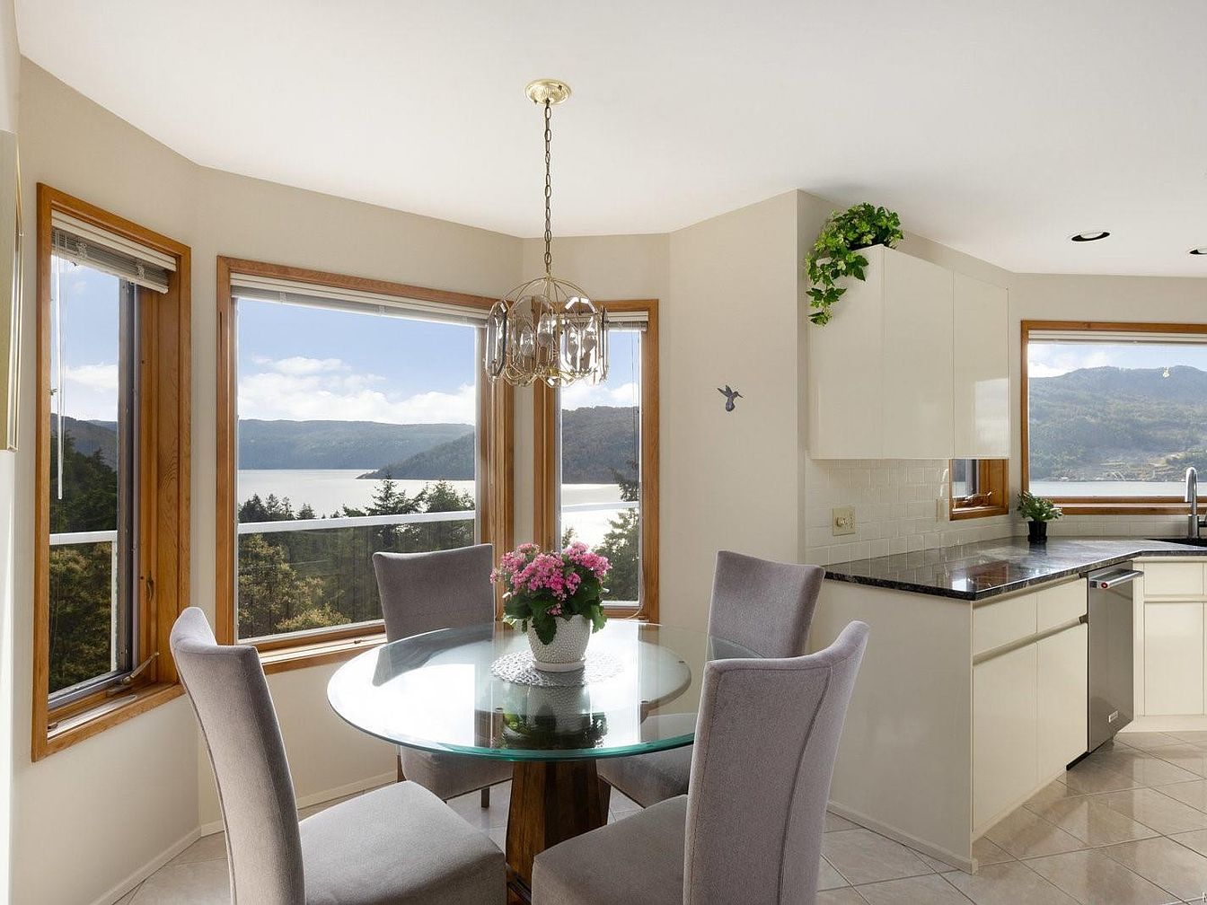 This cozy dining nook is nestled beside large windows that offer sweeping views of forested hills and a serene body of water beyond, flooding the space with natural light. The glass-top round table is accompanied by four upholstered chairs in a soft gray fabric, creating a comfortable yet elegant seating area. The kitchen features a modern design with sleek white cabinetry, black granite countertops, and a stainless steel dishwasher. Neutral beige walls and tile floors enhance the airy feel, while touches of greenery add life to the clean, sophisticated atmosphere. A chic pendant light fixture hangs above the table, completing the inviting breakfast space.