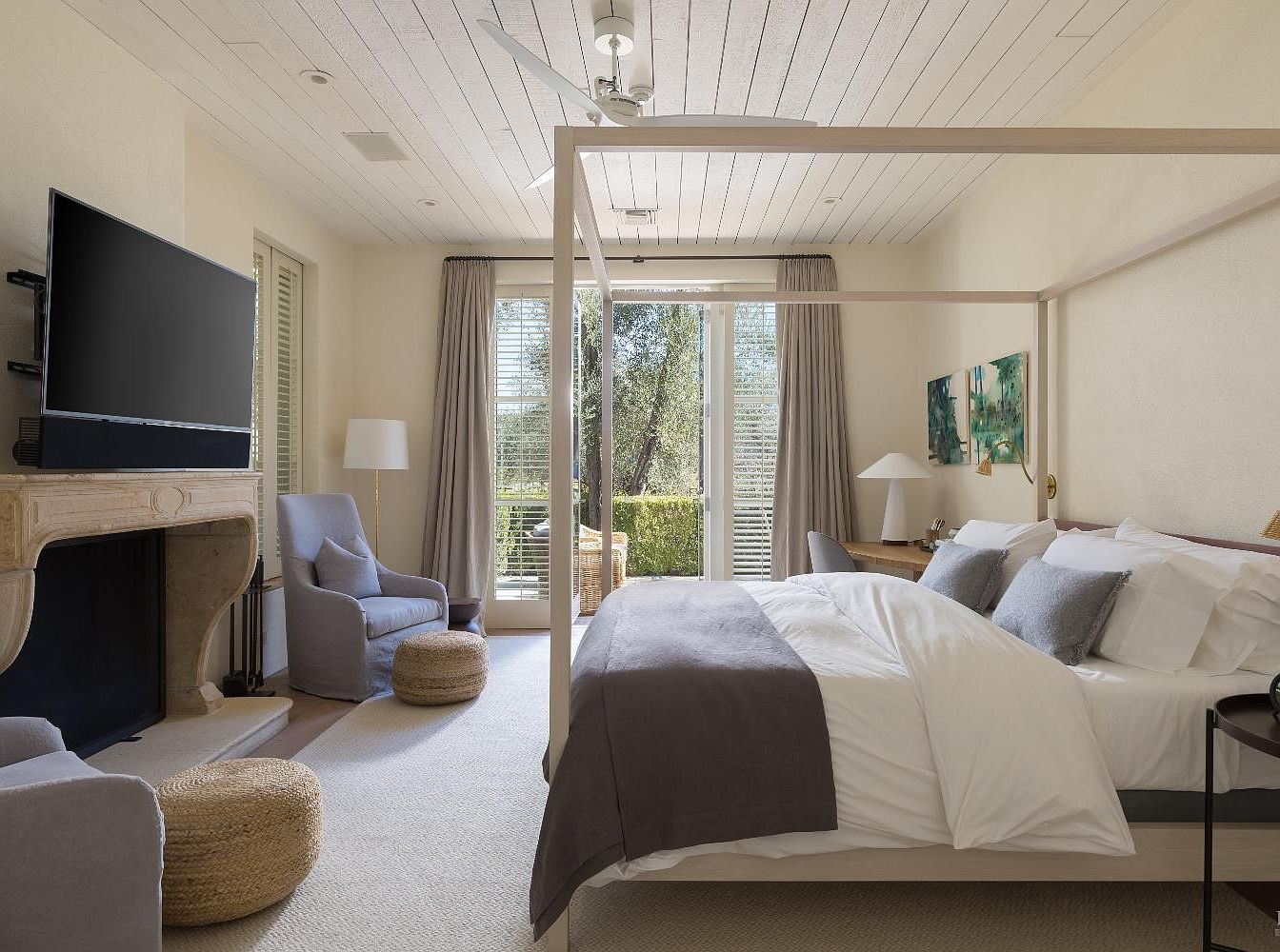 A bright, inviting bedroom with a modern four-poster bed takes center stage, featuring crisp white linens and soft gray accents. Natural light streams through large glass doors framed by neutral drapes, offering calming garden views and easy access to outdoor space—great for family mornings. Two plush armchairs with matching poufs sit near a stone fireplace and mounted television, creating a perfect nook for parents or children to relax. Warm beige walls and carpeting create a tranquil vibe, complemented by contemporary art and sleek bedside tables with lamps. The airy layout gives families ample room while maintaining a cozy, restful atmosphere.