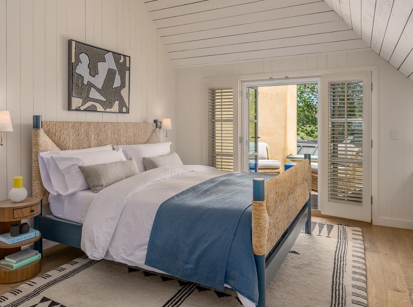 A spacious and inviting bedroom featuring a sloped, white shiplap ceiling and soft, neutral walls that create a calming atmosphere. The large bed has a textured woven headboard and footboard, dressed in crisp white linens with a muted blue throw and matching pillows, providing comfort and elegance. Built-in wall sconces offer lighting on each side of the bed, while a round wooden nightstand holds books and decorative accents. French doors with plantation shutters open to a small, sunlit balcony, bringing in natural light and fresh air, perfect for a family seeking a peaceful, airy sanctuary with ample space for relaxation and togetherness.