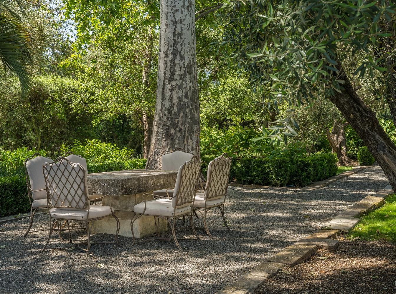 An inviting outdoor dining area nestled under the shade of mature trees creates a serene setting perfect for family gatherings. A stone rectangular table serves as the centerpiece, surrounded by six cushioned metal chairs featuring diamond-patterned backs for comfort and elegance. The gravel patio blends seamlessly with the surrounding greenery, bordered by neatly trimmed hedges and a paved garden path. Dappled sunlight filters through the leafy canopy overhead, providing a cool retreat on warm days. Spacious and open, this area offers a secure, tranquil, and picturesque environment for children to play and families to enjoy meals together.