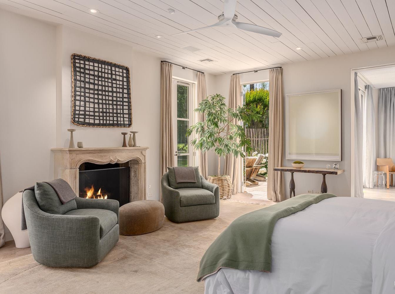 This spacious and serene bedroom centers around a classic stone fireplace, flanked by two plush, rounded armchairs and a cushioned ottoman, perfect for cozy family gatherings or warm evening chats. Large windows with neutral curtains flood the room with natural light, emphasizing the soft beige and green color palette that creates a calming atmosphere. The bed, adorned with crisp white linens and a sage green throw, faces the fireplace. A leafy plant in a woven basket adds a touch of nature, while modern art and minimal decorative accents keep the space stylish and uncluttered, ideal for a welcoming family retreat.