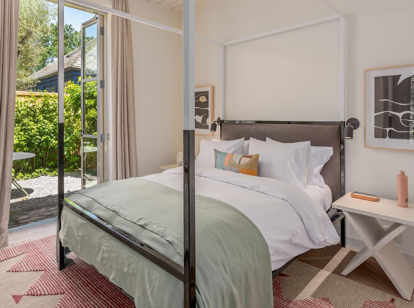 A sunlit bedroom features a modern four-poster bed with crisp white linens, a soft sage green comforter, and a colorful, geometric accent pillow. Neutral walls and minimalist decor foster a soothing atmosphere, while abstract framed artwork adds sophistication. Large glass doors open directly to a lush, fenced backyard, ideal for children to play or for enjoying outdoor relaxation. The space is enhanced by light taupe curtains, a patterned red and cream area rug, and coordinated white nightstands with unique X-bases. This harmonious design provides both comfort and easy access to nature, perfect for a family-friendly retreat.