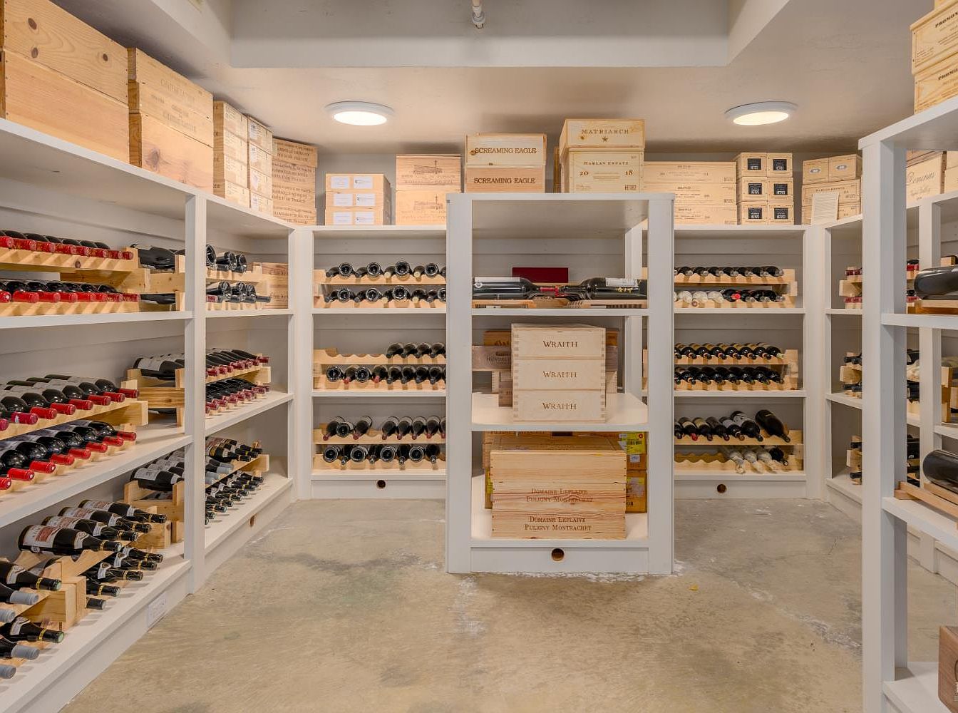 A spacious wine cellar features built-in white shelving lined with neatly arranged wine bottles, each resting in light wooden racks that keep them secure and organized. The concrete floor adds a rustic touch, while boxed collections and labeled crates are stacked on the upper shelves and in the central island, maximizing storage. Round ceiling lights bathe the room in gentle light, creating a warm and welcoming atmosphere. The cellar is designed for accessibility and safety, keeping valuable bottles out of reach of children, while the open layout and ample shelving offer an efficient solution for family storage needs and entertaining guests.