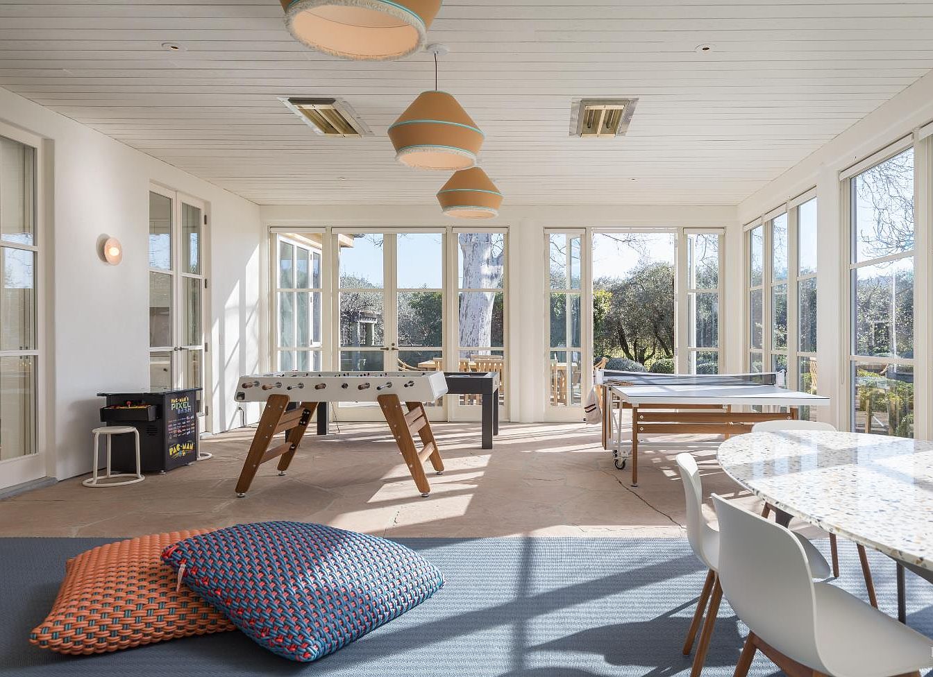 Bright and spacious, this family game room is flooded with natural light from tall windows lining three walls, offering views of greenery outside. The room features a foosball table, a ping-pong table, and a vintage arcade machine, making it inviting for both kids and adults. A cozy area rug is spread on the floor with colorful woven floor cushions for comfortable lounging and play. The space includes a modern round dining or activity table surrounded by sleek white chairs. Soft beige tile flooring and a white paneled ceiling with contemporary pendant lights complete the welcoming, airy design, perfect for family gatherings and activities.