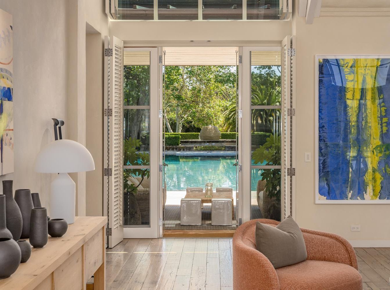A spacious, sunlit room features wide glass doors that open directly to a sparkling backyard pool, blending indoor comfort with outdoor enjoyment, perfect for family gatherings. The neutral-toned walls complement light wood flooring, creating a warm and welcoming ambiance. Contemporary furnishings include a soft, peachy armchair and a natural wood console topped with sculptural black vases and a modern white lamp. Large, vibrant blue and yellow abstract artwork adds a lively touch to the decor. The layout emphasizes ease of movement and visibility for supervising children, making the space both stylish and family-friendly.