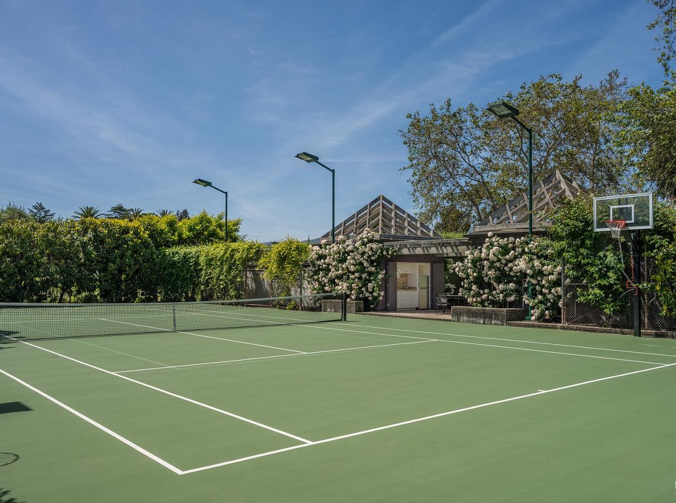 A spacious outdoor sports court designed for tennis and basketball, surrounded by mature greenery and privacy hedges that create a peaceful, family-friendly atmosphere. The court features a smooth green playing surface with crisp white boundary lines. To the right, a basketball hoop is integrated into the fencing, offering multiple recreational options for children and adults alike. Beyond the court, a well-maintained garden blooms with white flowers, climbing over a pergola structure that covers a comfortable seating or resting area. Tall light poles stand ready for evening games, making this space ideal for active families who value outdoor play.