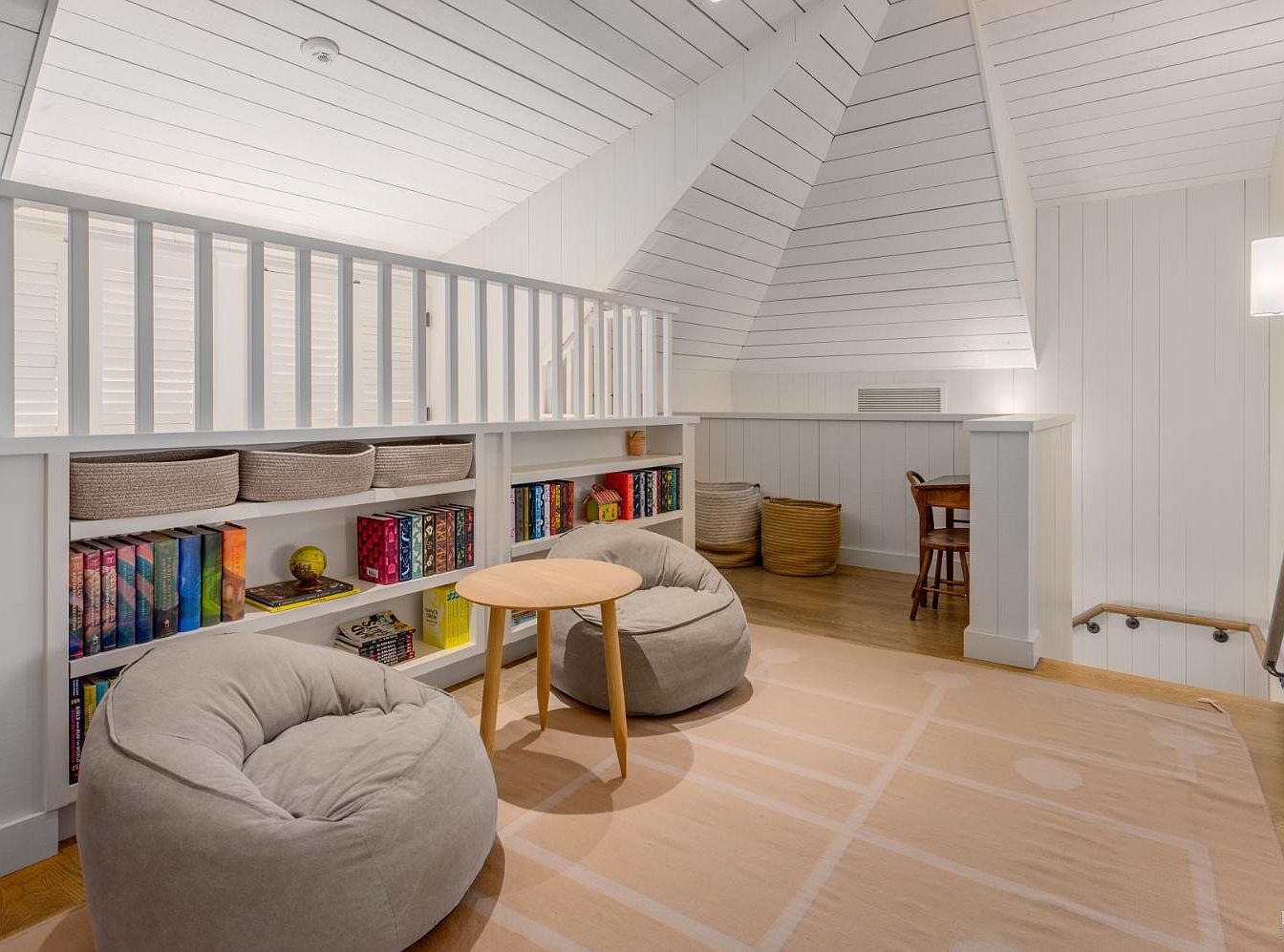 A cozy loft area designed for family relaxation and children’s activities, featuring white shiplap walls and vaulted ceilings that create an open, airy feel. Built-in shelving lines the wall, filled with colorful books, games, and woven storage baskets for easy organization. Two plush, light-gray beanbag chairs and a small, round wooden table provide an inviting spot for reading or playing games. A large, soft area rug with a playful pattern covers the hardwood floor, adding comfort and warmth. In the corner, a child-sized wooden table and chair encourage creativity and study. The space is bright, safe, and full of charm.