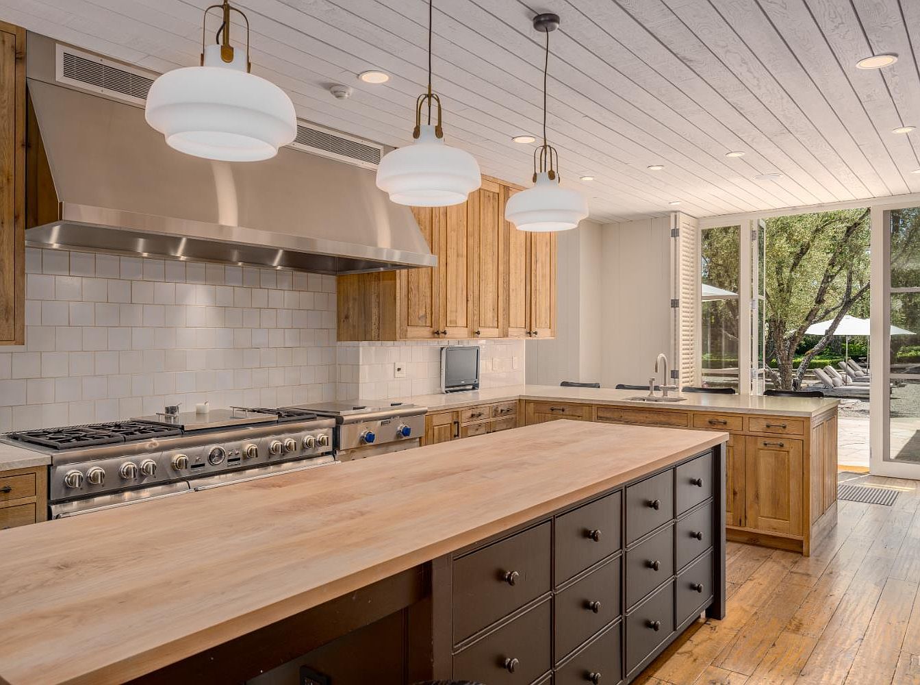 A large, open kitchen featuring a generously sized central island with a light wood countertop and dark cabinetry beneath, ideal for family meal prep or casual gatherings. Natural wood cabinets line the walls, paired with a sleek stainless steel stove and range hood, while classic white subway tiles provide a bright, clean backdrop. Three modern pendant lights illuminate the workspace, creating a warm atmosphere. The kitchen seamlessly connects to the outdoors through expansive glass doors, offering views of greenery and easy access for children to play. The hardwood floors and neutral color scheme enhance both comfort and family-friendly functionality.