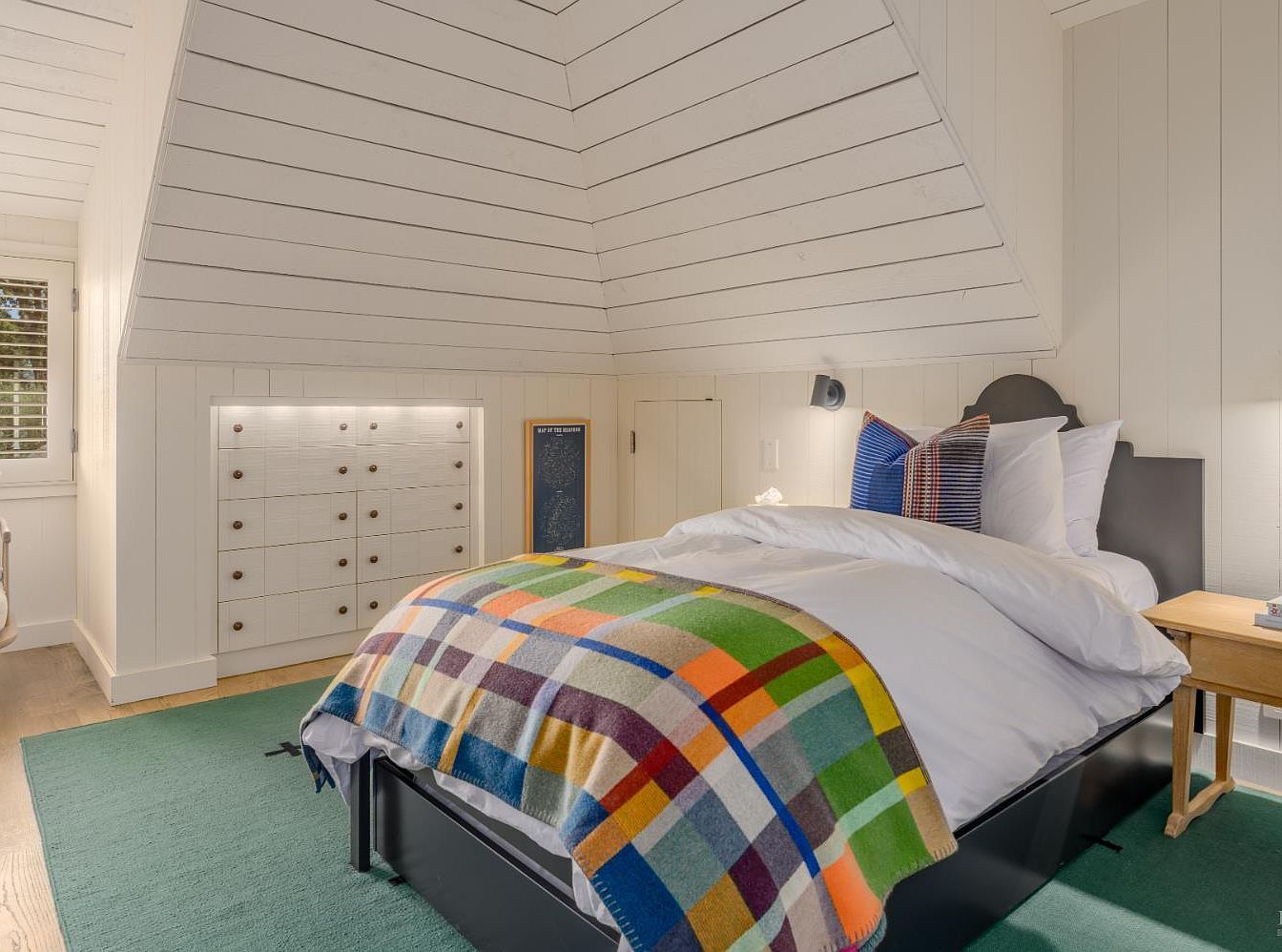 A welcoming attic bedroom features slanted, white shiplap ceilings and walls that create a bright and airy feel, perfect for a peaceful retreat. At the center is a full-sized bed adorned with crisp white linens, colorful pillows, and a plaid blanket in vibrant hues, adding playful warmth. Pale wood nightstands and a built-in dresser with small drawers lend plenty of storage, ideal for families needing space. Soft green carpeting brings color and comfort underfoot, while large windows with shutters nearby provide natural light. The charming design and smart storage solutions make this a functional, family-friendly space.