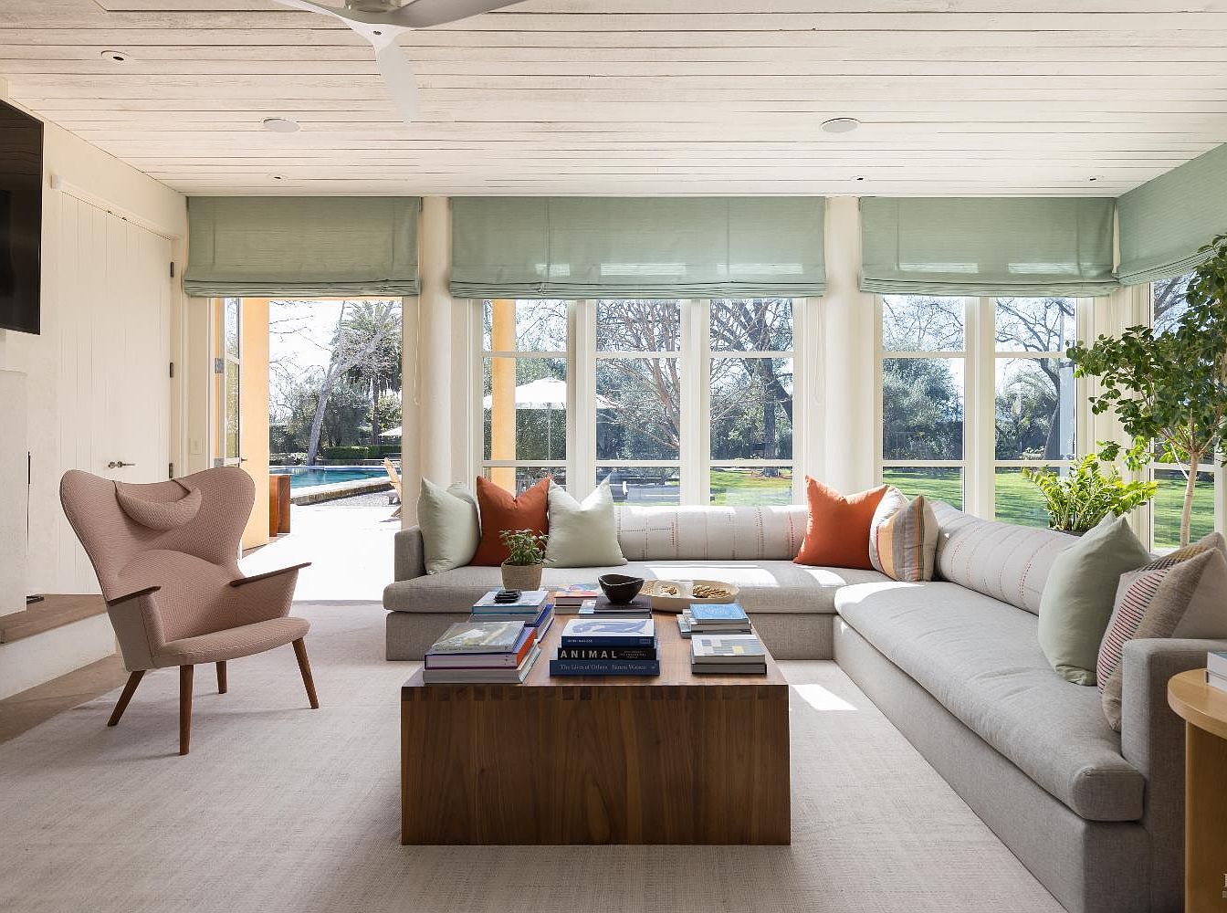A spacious living room with a bright, airy ambiance, featuring a large L-shaped light gray sectional sofa adorned with assorted throw pillows in muted green and burnt orange tones. A soft neutral area rug covers the floor, grounding the cozy seating area around a substantial wooden coffee table filled with books and small decorative items. The walls are lined with expansive windows allowing abundant natural sunlight, with soft green roman shades providing privacy and light control. Architectural details like a white shiplap ceiling and modern ceiling fan enhance the open, fresh look, while family-friendly touches include ample seating, durable finishes, and open sight lines to the backyard and pool visible through the windows.