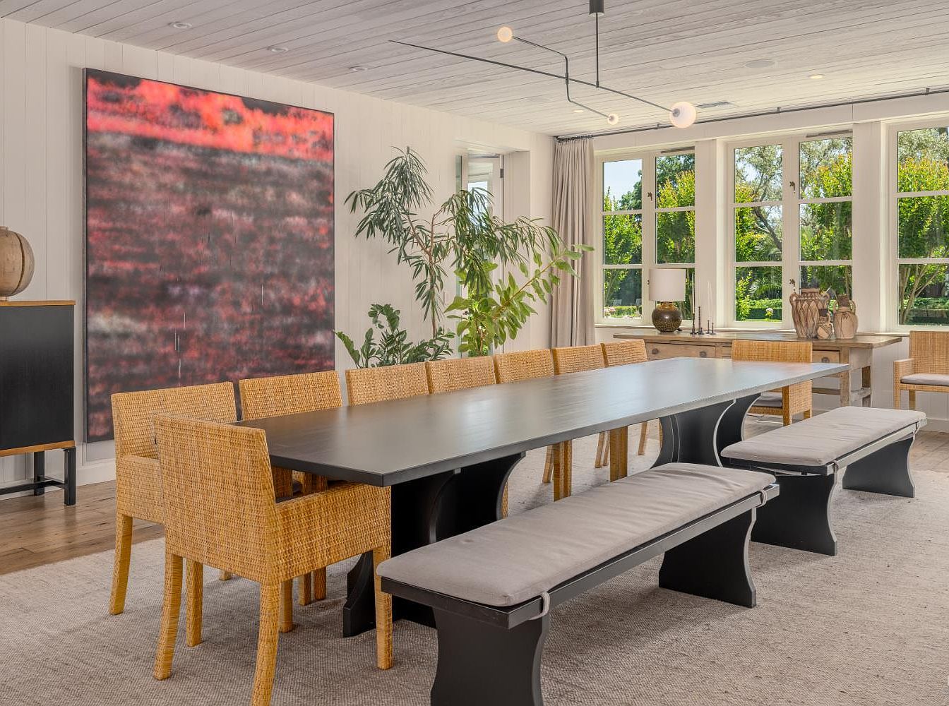 A long, sleek black dining table stretches across the bright open space, surrounded by a mix of woven rattan armchairs and cushioned benches, offering comfortable seating for large family gatherings. Warm wood flooring and an inviting neutral area rug add coziness, while large windows along the wall fill the room with natural light and provide views of lush greenery outside. Modern overhead lighting and a bold, abstract painting give the space a sophisticated touch. Potted plants and a sideboard with decorative items create a welcoming, family-friendly atmosphere perfect for shared meals and entertaining.