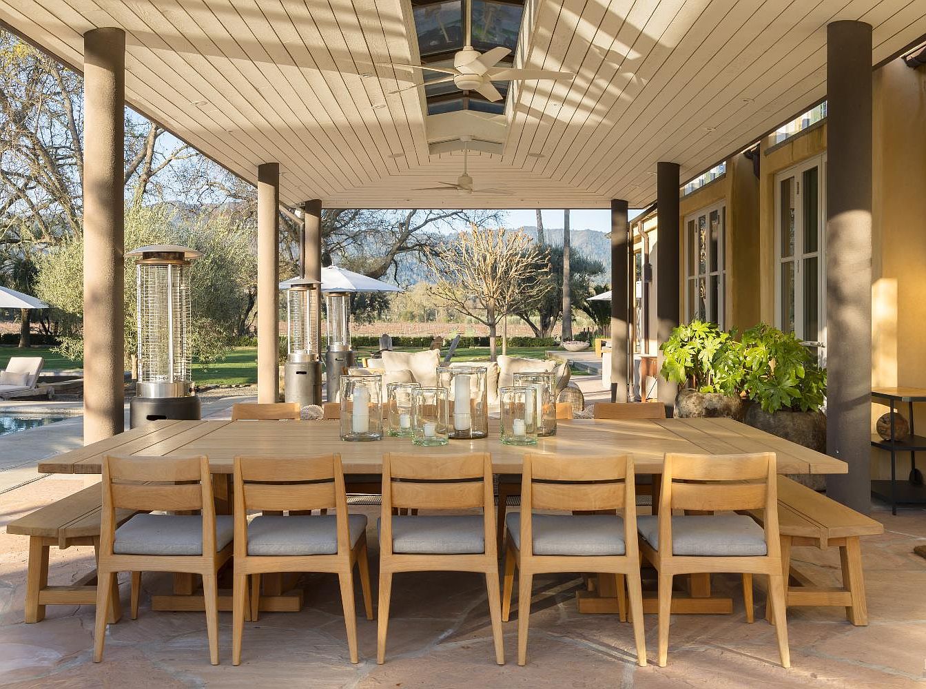 A spacious covered patio features a large wooden dining table surrounded by matching chairs with soft gray cushions, comfortably seating at least ten. The ceiling is wood-paneled with two ceiling fans and a central skylight, allowing natural light to filter through. Glass candle holders are arranged on the table, adding a touch of elegance. The patio opens to a lush, well-maintained backyard with trees, manicured lawns, and outdoor heaters for comfort. The area is perfect for family gatherings and outdoor meals, with easy access to the garden and pool, making it an inviting and safe space for all ages.