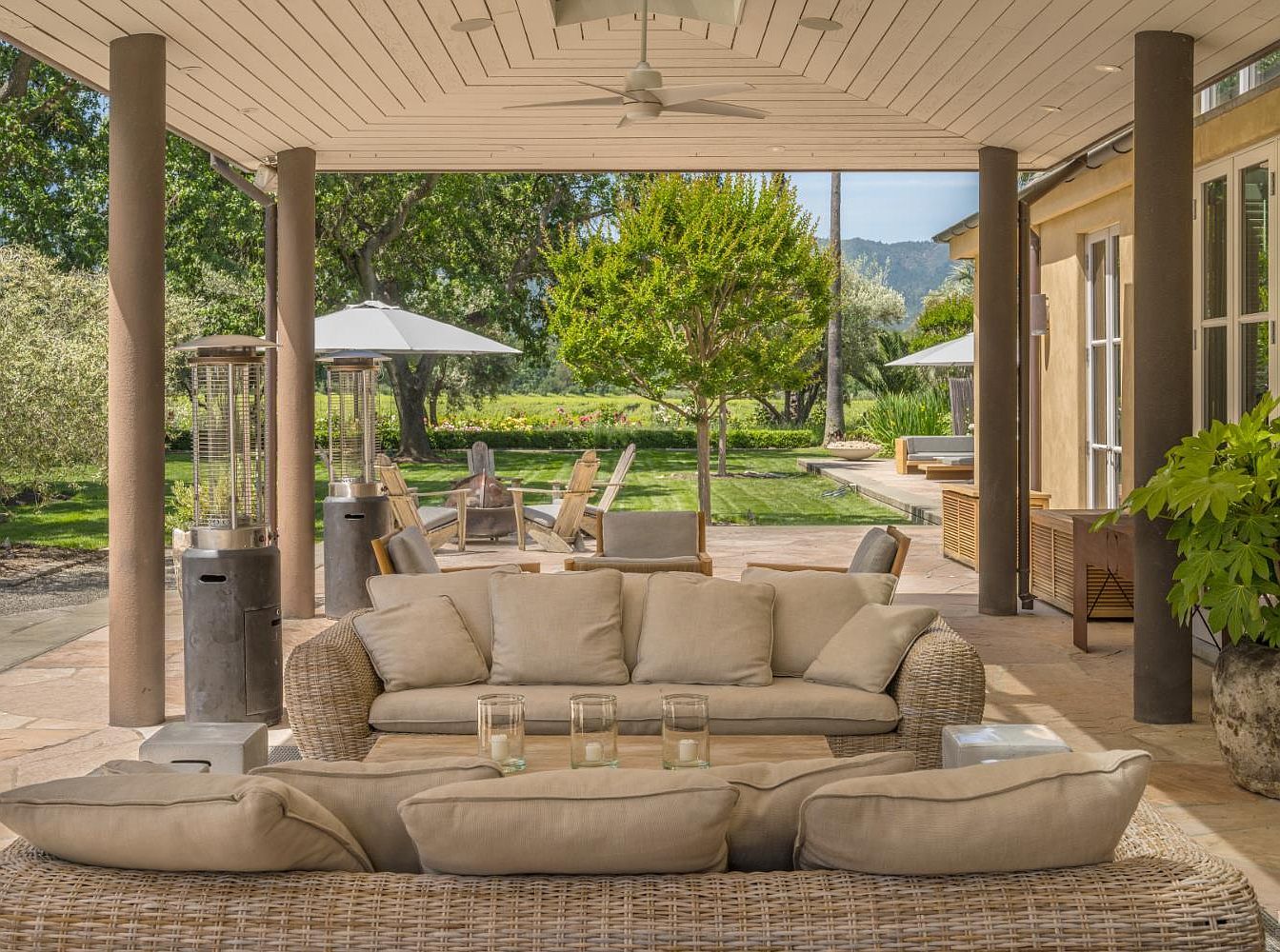 A spacious covered patio area is featured, offering a comfortable outdoor living space ideal for family gatherings. The seating includes two large, beige wicker sofas with plush cushions arranged around a low coffee table adorned with decorative candle holders. The patio’s ceiling is lined with light wood paneling and fitted with a ceiling fan for added comfort. Tall, slender columns frame the view of the lush green backyard, shaded by mature trees. Stylish patio heaters and wooden lounge chairs dot the area, which extends seamlessly onto a manicured lawn, creating a safe and inviting environment for kids to play while adults relax.