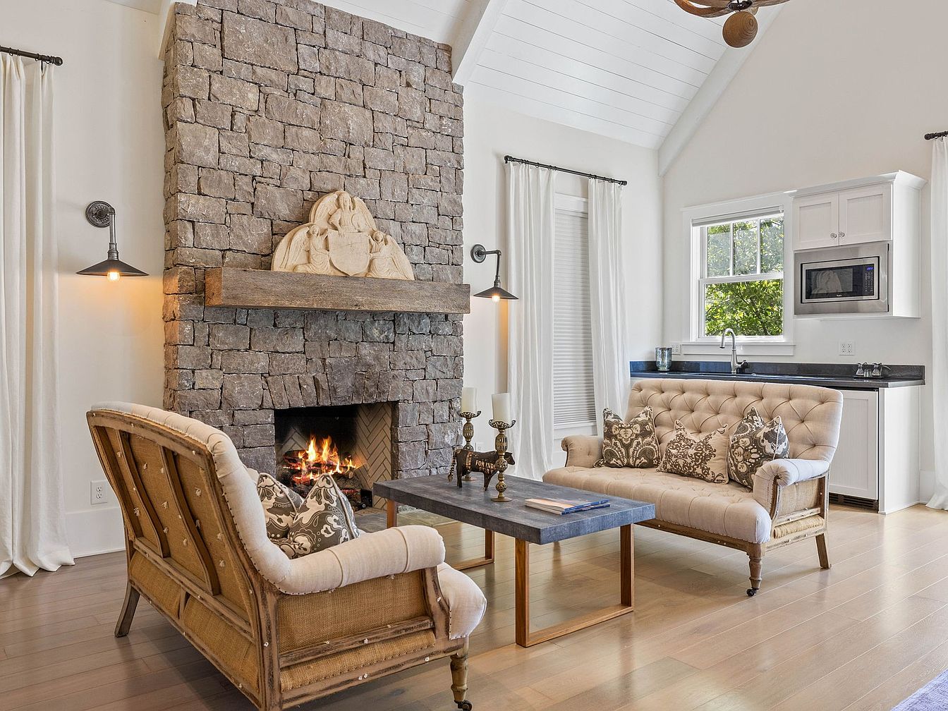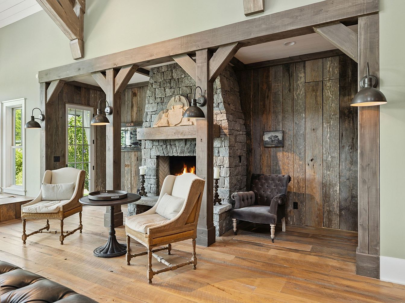 A welcoming family gathering spot featuring a rustic stone fireplace framed by exposed wooden beams and weathered wood paneling. The space boasts two comfortable, cushioned armchairs with neutral upholstery and wooden frames, positioned around a round, sturdy wooden table, perfect for playing games or sharing snacks. Light pours in from large windows and glass doors, giving the room a bright, airy feel. Wall sconces add soft, ambient lighting. The wide-plank wood floors complement the farmhouse aesthetic, while a tufted velvet armchair adds a touch of elegance. The layout is open, cozy, and ideal for family relaxation, conversation, and warmth.