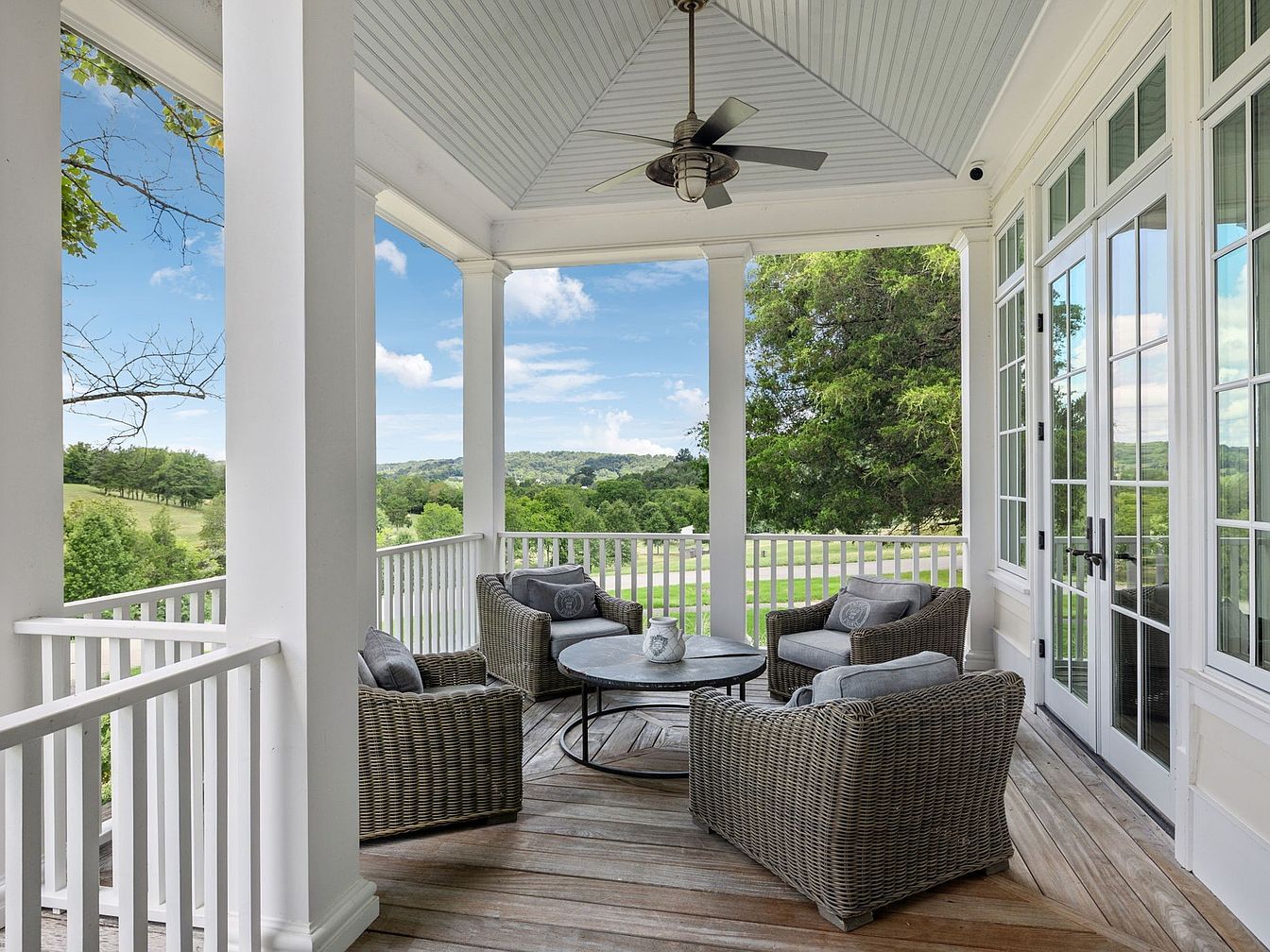 A spacious covered porch features four wicker armchairs with plush gray cushions arranged around a circular coffee table, encouraging comfortable gatherings for family and friends. The porch is designed with crisp white railings and columns, a vaulted beadboard ceiling with a ceiling fan for added comfort, and wide French doors offering an elegant entrance to the indoor space. Natural wood plank flooring adds warmth and charm, while expansive views of rolling green hills and trees create a serene, inviting backdrop. The layout offers safety for children with sturdy railings and plenty of space for relaxation or play.