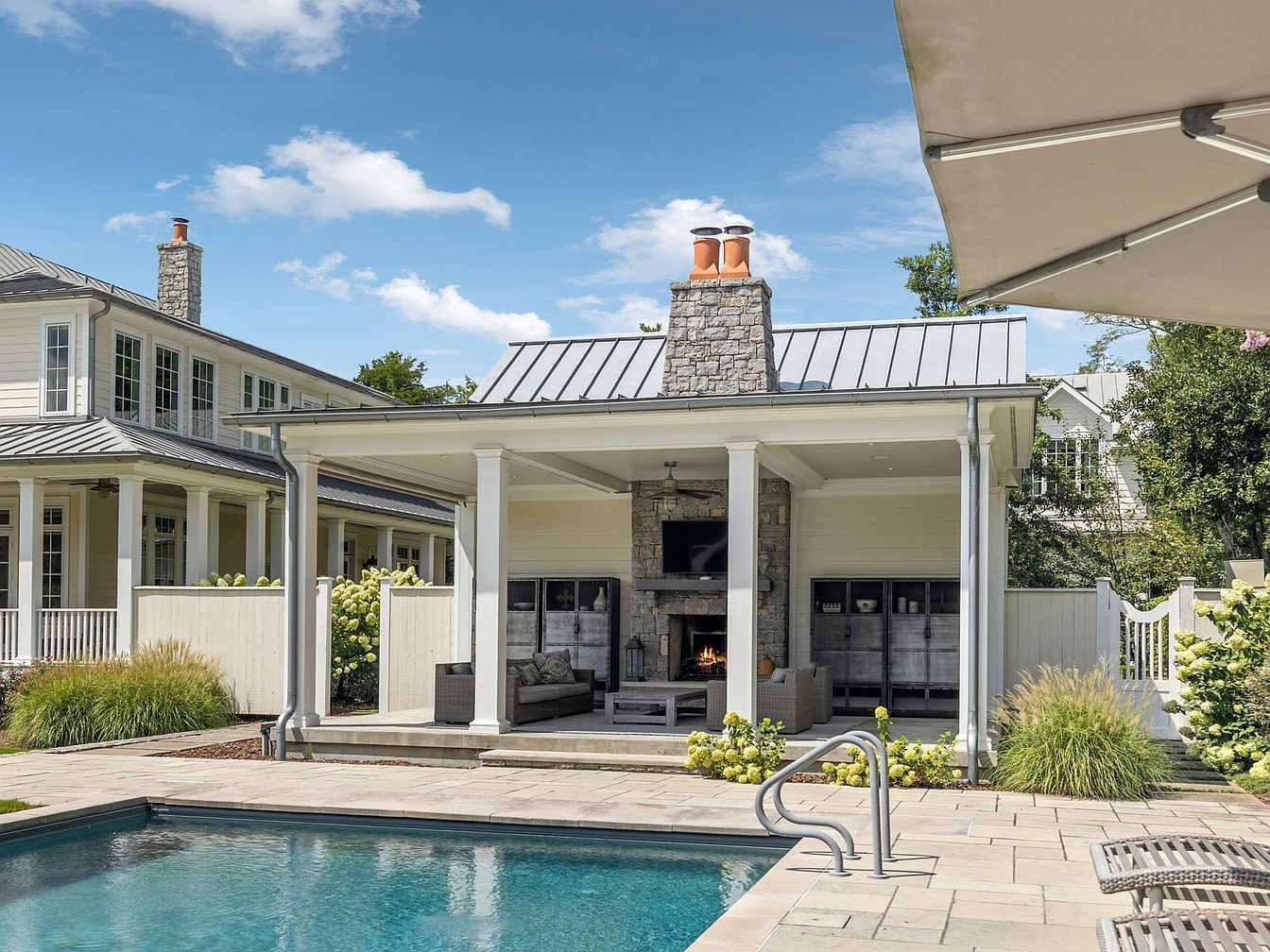 A spacious covered patio is situated beside a sparkling in-ground swimming pool, creating an inviting family retreat. Classic white columns support the roof of the patio, while a substantial stone fireplace with twin chimney stacks establishes a cozy focal point. Light beige siding and tidy trim mirror the main house’s elegant exterior, maintaining visual harmony throughout the property. The patio features comfortable, weather-resistant seating arranged around the fireplace and a built-in shelving area for outdoor essentials. Lush green landscaping and blooming hydrangeas soften the edges, and ample space around the pool and patio ensures safe, family-friendly enjoyment for all ages.