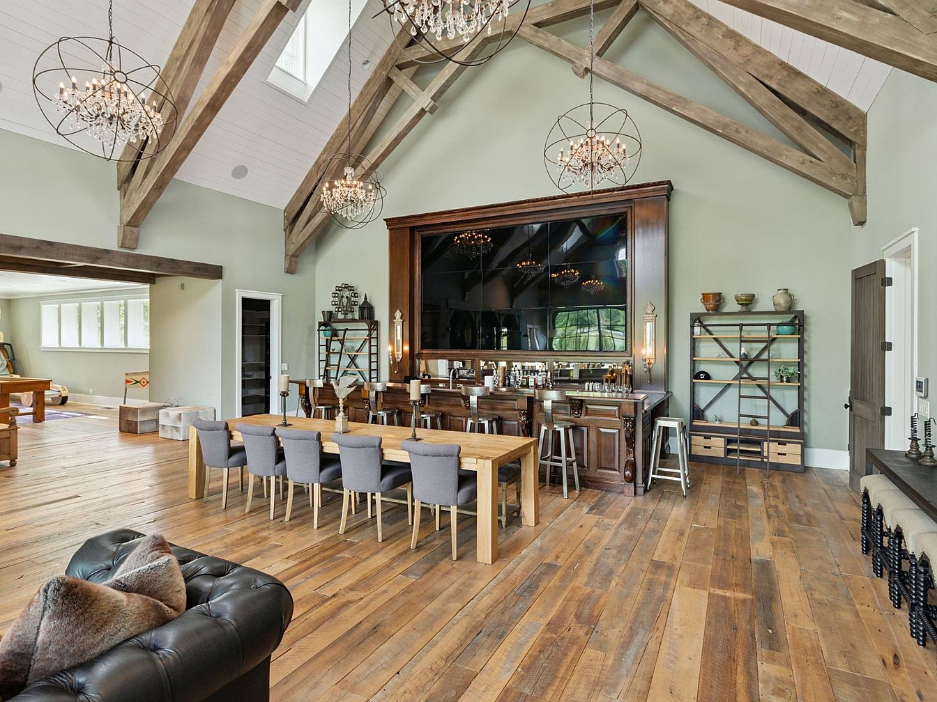Spacious open-concept dining and bar area with soaring vaulted ceilings accented by rustic exposed wooden beams and elegant spherical chandeliers. A large, natural wood dining table accommodates ten comfortably with cushioned grey chairs, ideal for family meals or gatherings. The adjacent bar features a dark wood counter with mirrored panels above, metal barstools, and well-organized shelving for display or storage. Pale sage green walls, wide plank hardwood floors, and ample natural light from overhead windows create a warm, inviting atmosphere. The room flows seamlessly to a recreation space, making it perfect for family activities and entertaining guests.