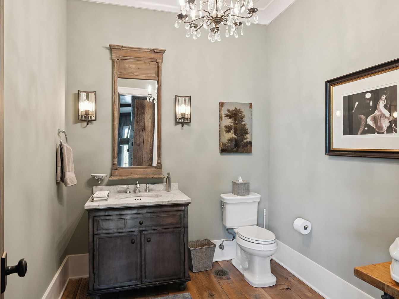 A well-appointed bathroom features a classic farmhouse-style vanity with a dark wood finish and a marble countertop, centered below a tall, rustic framed mirror. Two elegant wall sconces flank the mirror, creating a warm and inviting atmosphere. The walls are painted a soothing light sage green, complementing the natural wood tones of the wide-plank floorboards. Decorative touches include a crystal chandelier, a nature-inspired painting, and a framed black-and-white print. The layout offers ample space around the vanity and toilet, making it accessible and family-friendly. Soft towels, tissue, and practical storage baskets enhance the comfort and functionality of the room.