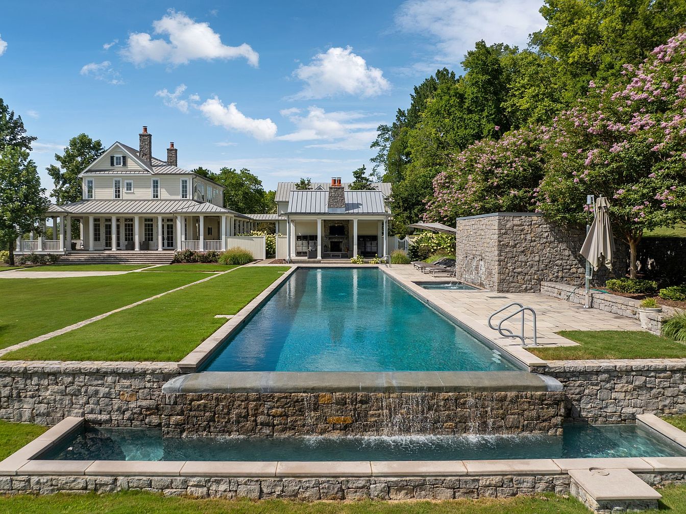 A serene backyard oasis features a sparkling rectangular pool bordered by neatly cut grass and accented with stone walls and a cascading water feature at the far end. The pool’s clean lines are flanked by a broad patio space, perfect for outdoor lounging and family activities. Mature flowering trees and lush landscaping provide privacy and natural beauty. In the background, a stately two-story American home with a wraparound porch and classic metal roof blends traditional architecture with modern comfort. This open, inviting space is perfect for children’s play, family gatherings, and safe outdoor entertainment in a peaceful, sunlit setting.