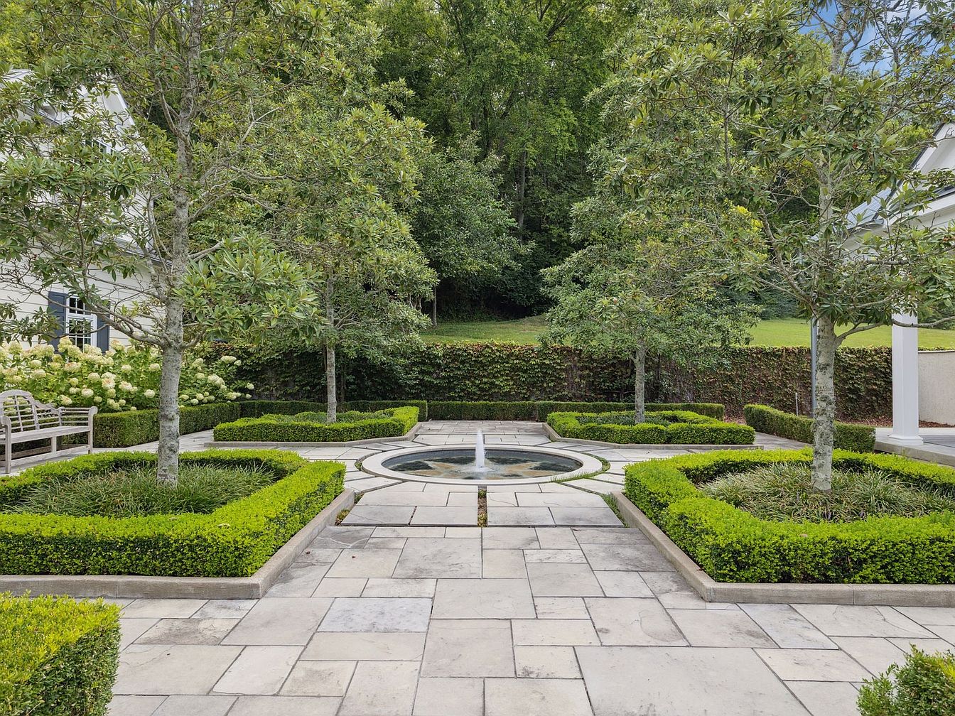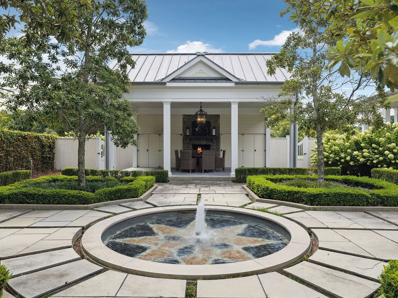 A beautifully landscaped garden patio features a central circular fountain with water gently bubbling, surrounded by a spacious paved walkway in a radial pattern. Neatly trimmed boxwood hedges and shaded trees frame the garden, offering plenty of green space and natural beauty ideal for outdoor family gatherings and play. The backdrop reveals a classic American-style porch with white pillars, a cozy seating area, and an inviting stone fireplace, perfect for alfresco dining or relaxing together. Subtle beige, white, and lush green tones create a serene, inviting ambiance, highlighting a family-friendly outdoor space that balances elegance with comfort.