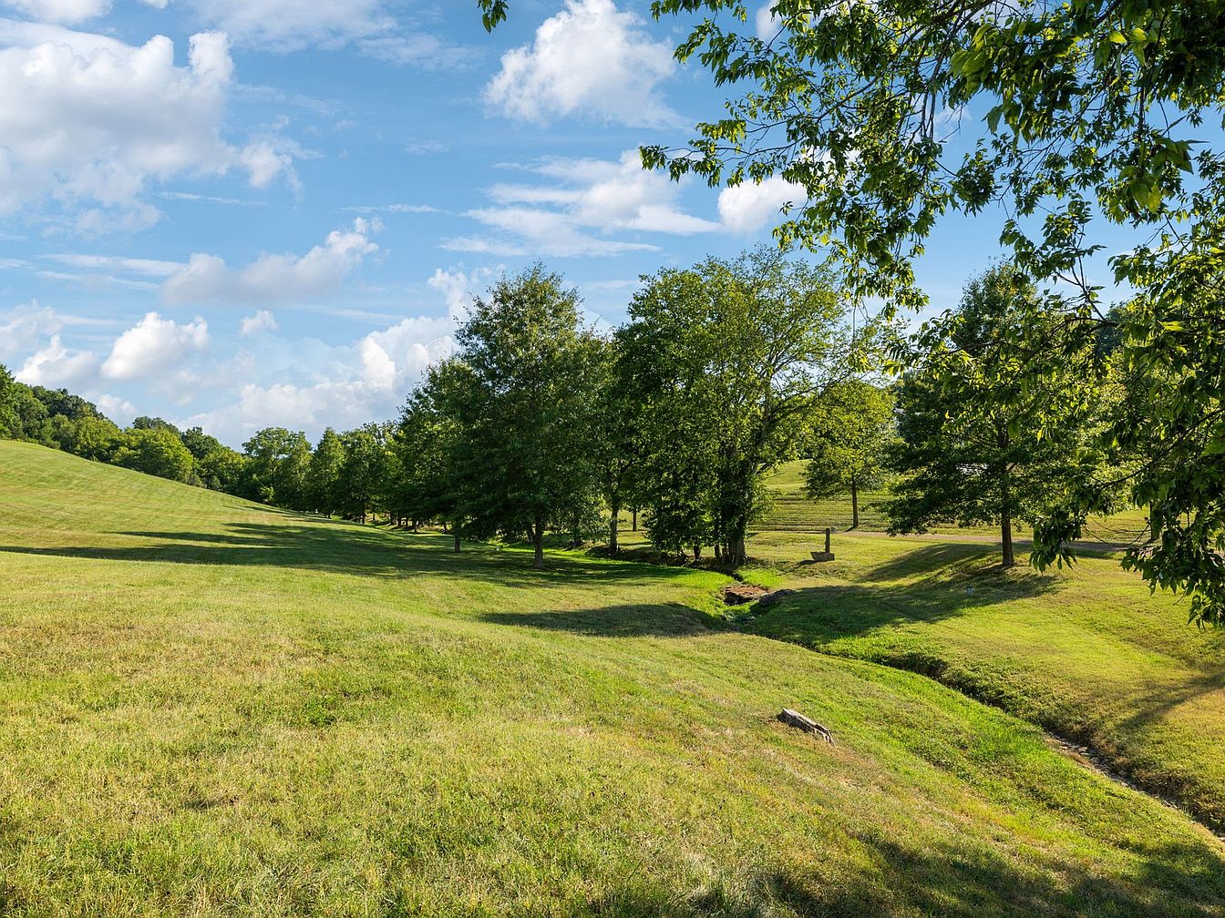 Expansive, gently rolling grassy backyard bordered with mature shade trees, creating a peaceful and spacious setting perfect for family gatherings, playtime, and outdoor activities. The open lawn is ideal for children to run freely and for hosting picnics or barbecues, with plenty of room for games. A small creek meanders through the property, adding a natural charm and a sense of tranquility. The landscape is lush and green, blending with the surrounding countryside. Bright blue sky with fluffy clouds and leafy trees enhance the inviting, family-friendly ambiance of this idyllic outdoor space, making it an appealing place for relaxation and recreation.