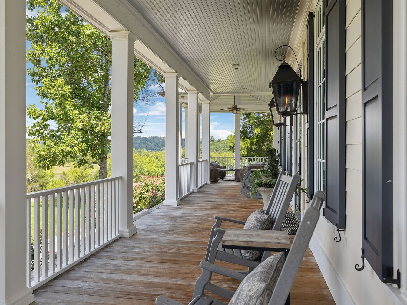 Expansive covered front porch featuring classic white railings and columns offers a warm, welcoming space perfect for family gatherings or relaxing afternoons. The wood plank flooring and neutral tones of the siding create a timeless, inviting look, while black shutters and a large lantern-style light fixture add distinctive charm. Comfortable rocking chairs with decorative pillows provide a cozy place to unwind, and a ceiling fan ensures comfort in warmer months. Gentle greenery surrounds the porch, framed by scenic countryside views, making this space ideal for children to play safely or families to enjoy tranquil moments together amidst nature.