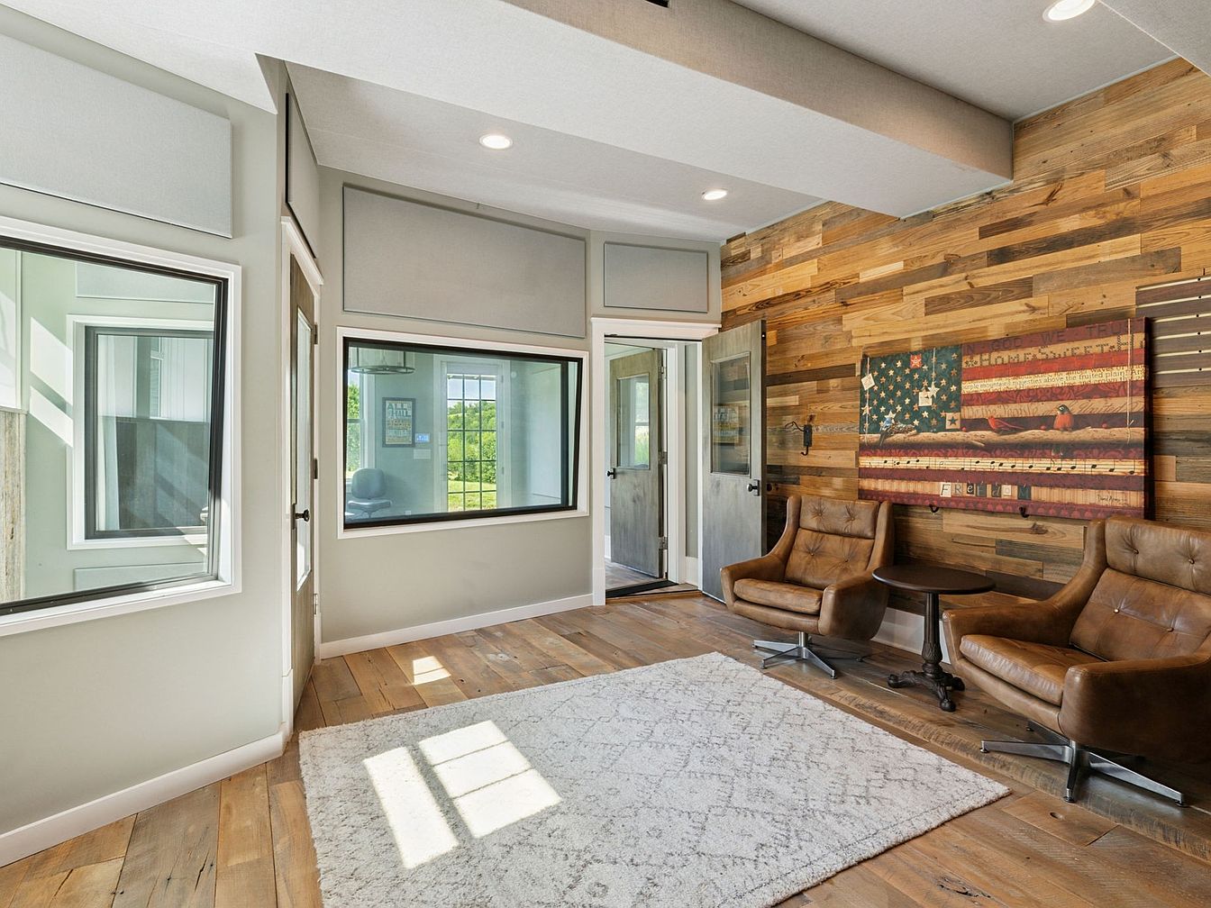 A beautifully bright and welcoming sunroom features a large multi-pane window and glass doors, letting in an abundance of natural light. The room is styled with a rustic wood accent wall that adds warmth and visual texture, complemented by a large artwork of the American flag. Two caramel-colored leather swivel chairs with tufted backs are paired with a dark round side table, offering a cozy spot for family members to relax or have conversations. The flooring is wide-plank, light-toned wood, and a soft, patterned cream rug anchors the space for a comfortable, child-friendly environment.