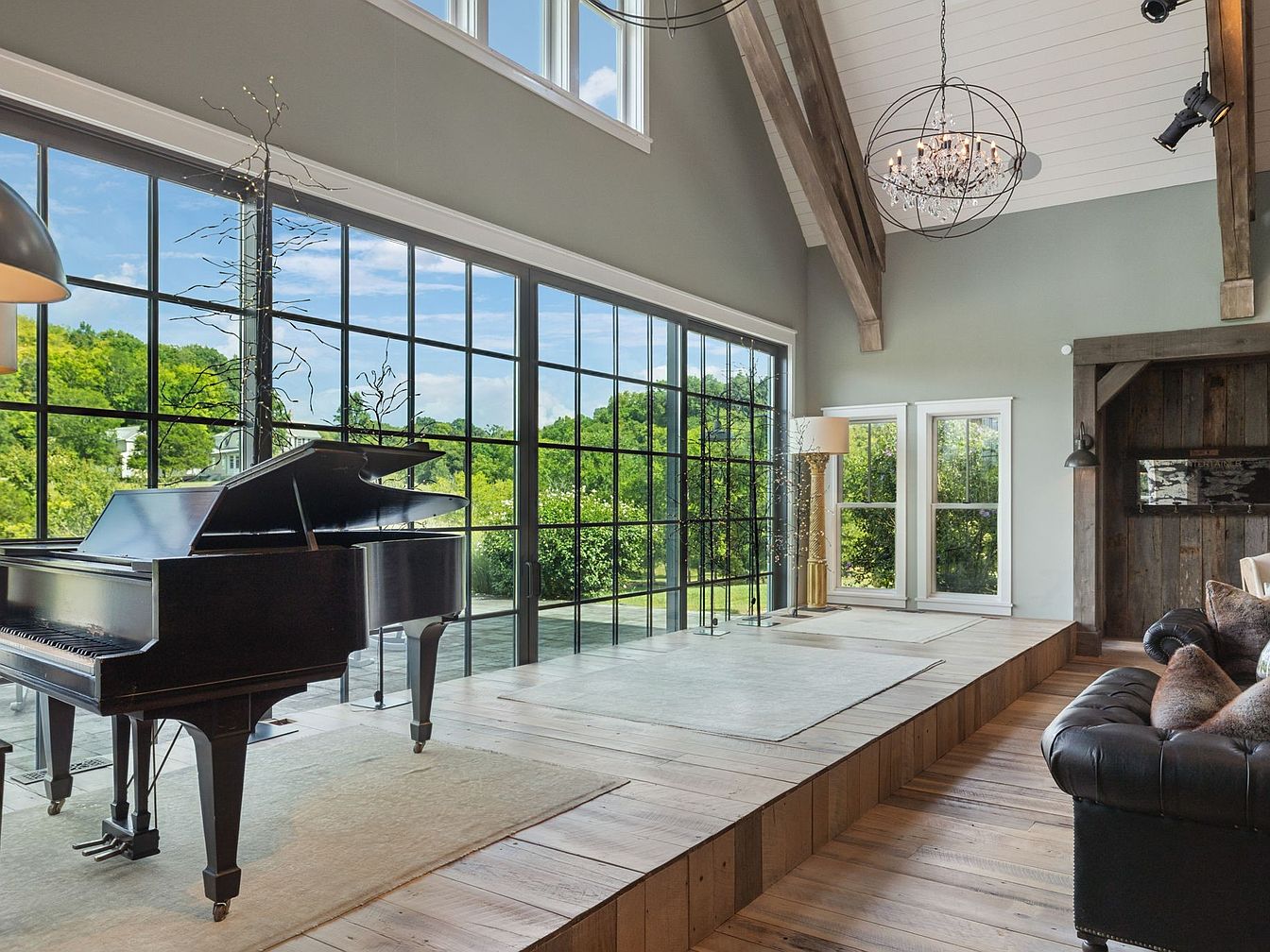 A spacious music room features a raised wooden stage with a black grand piano as the centerpiece, set against a dramatic wall of floor-to-ceiling windows that fill the space with natural light and offer expansive green garden views. The high vaulted ceiling with exposed beams and a modern chandelier adds architectural interest. Soft area rugs on the stage create a comfortable setting for family gatherings or children’s performances. Cozy seating with plush cushions invites relaxation, while the neutral color palette of soft greys, natural wood, and black accents ensures versatility and a welcoming atmosphere for all ages.