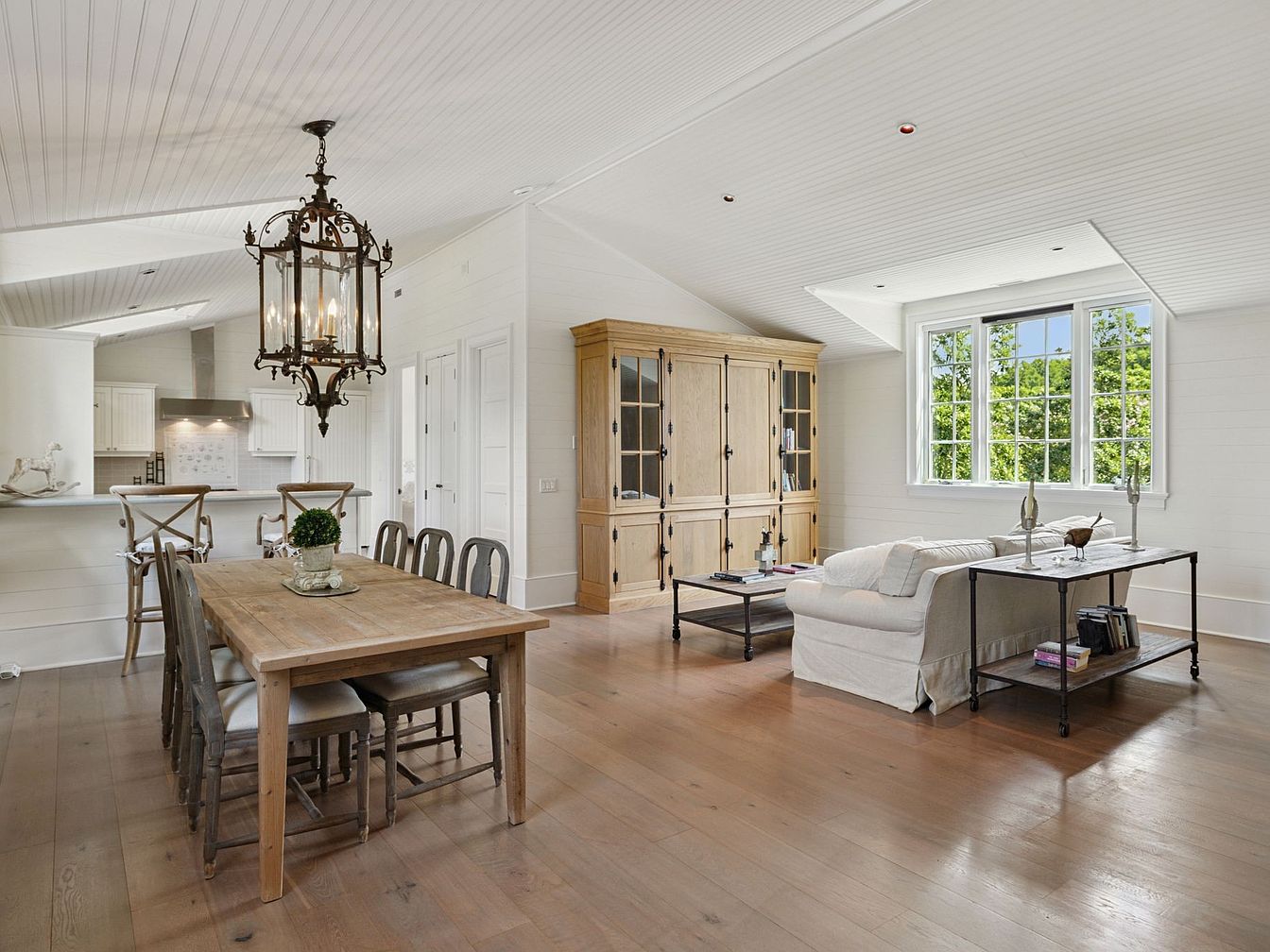 A spacious open living area flows seamlessly into a dining and kitchen space, all unified by soft wood flooring and white paneled ceilings and walls that enhance the natural light pouring through large windows. The living room features a plush, inviting sofa facing a substantial wooden cabinet, perfect for storage and family games. The adjacent dining area seats six around a sturdy wooden table beneath an elegant vintage-style chandelier, fostering family meals and gatherings. A practical island with barstools smoothly transitions into the kitchen, making meal prep shared and social. The neutral tones and natural materials create a warm, welcoming setting ideal for families.