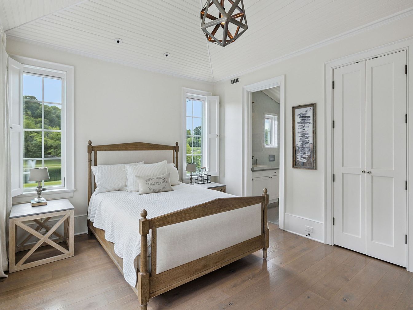 A serene and inviting bedroom features light wood floors, soft white walls, and a classic wooden bed with crisp white bedding and layered pillows for comfort. Large windows on either side of the bed bring in abundant natural light, creating a cheerful, open atmosphere and offering beautiful outdoor views, perfect for families wanting a peaceful space. Two matching nightstands with modern lamps provide functional bedside storage. The room connects directly to a private bathroom, enhancing convenience and privacy. Elegant details like the geometric ceiling light fixture and subtle wall art add warmth and style, making it ideal for family relaxation and restful nights.