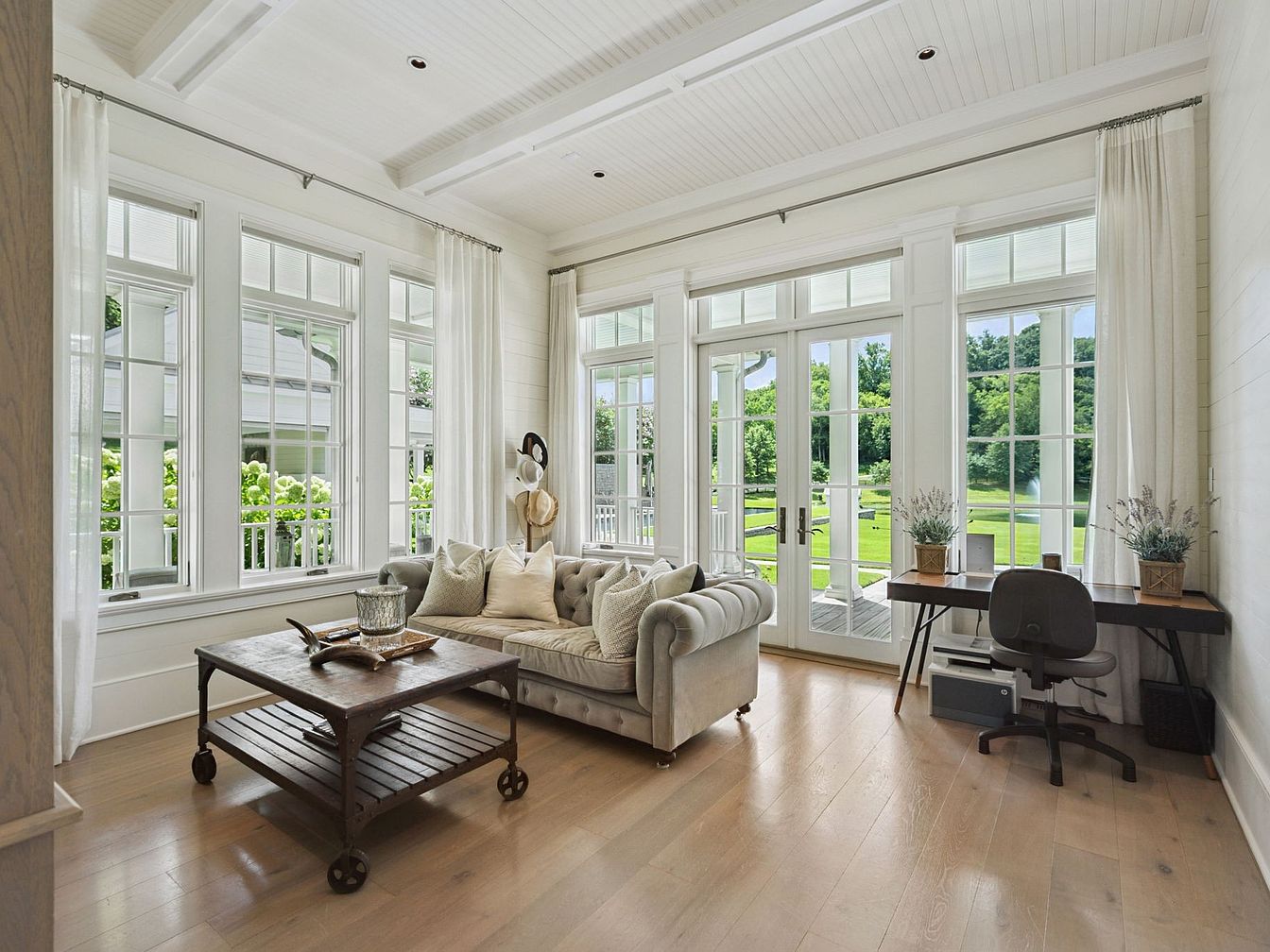 Spacious sitting area with a serene, family-friendly design featuring large windows and glass French doors that flood the space with natural light and offer beautiful views of the lush, green yard outside. The room has light wood flooring and white-paneled walls and ceiling with exposed beams, creating a bright, airy atmosphere. Furniture includes a plush tufted grey couch accented with neutral throw pillows, and a sturdy wooden coffee table on wheels for easy movement—perfect for gatherings or playtime. A practical workspace desk sits against the wall, ideal for homework or remote work, while simple, elegant potted plants and sheer curtains add softness and warmth.