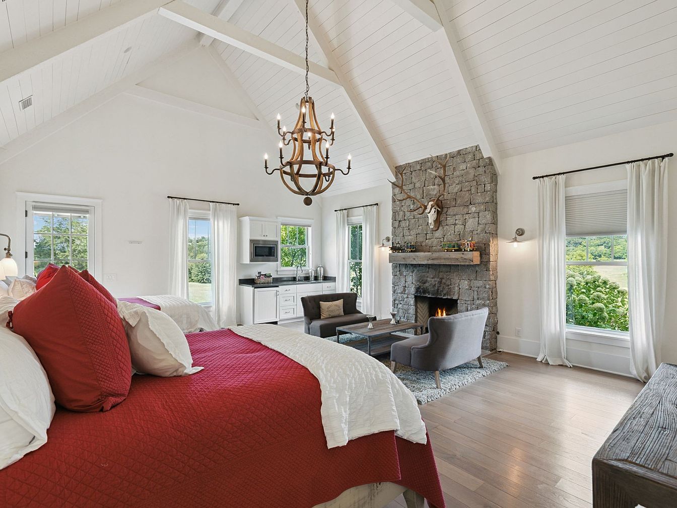A spacious and inviting master bedroom features a vaulted, white-painted ceiling with exposed beams, giving the space an airy, open feel. Natural light pours in from multiple large windows dressed with simple white curtains, offering peaceful views of green landscapes. The room combines sleeping and sitting areas, ideal for family relaxation. A plush bed with deep red bedding and an assortment of pillows adds warmth and color. Across from the bed, a stone fireplace with a rustic mantel and antler decor serves as a cozy focal point. Soft gray armchairs and a coffee table create a comfortable conversation spot on a textured rug, while a compact kitchenette offers extra family convenience.