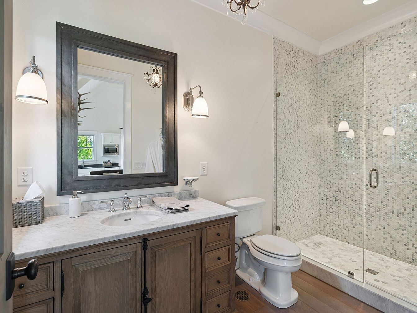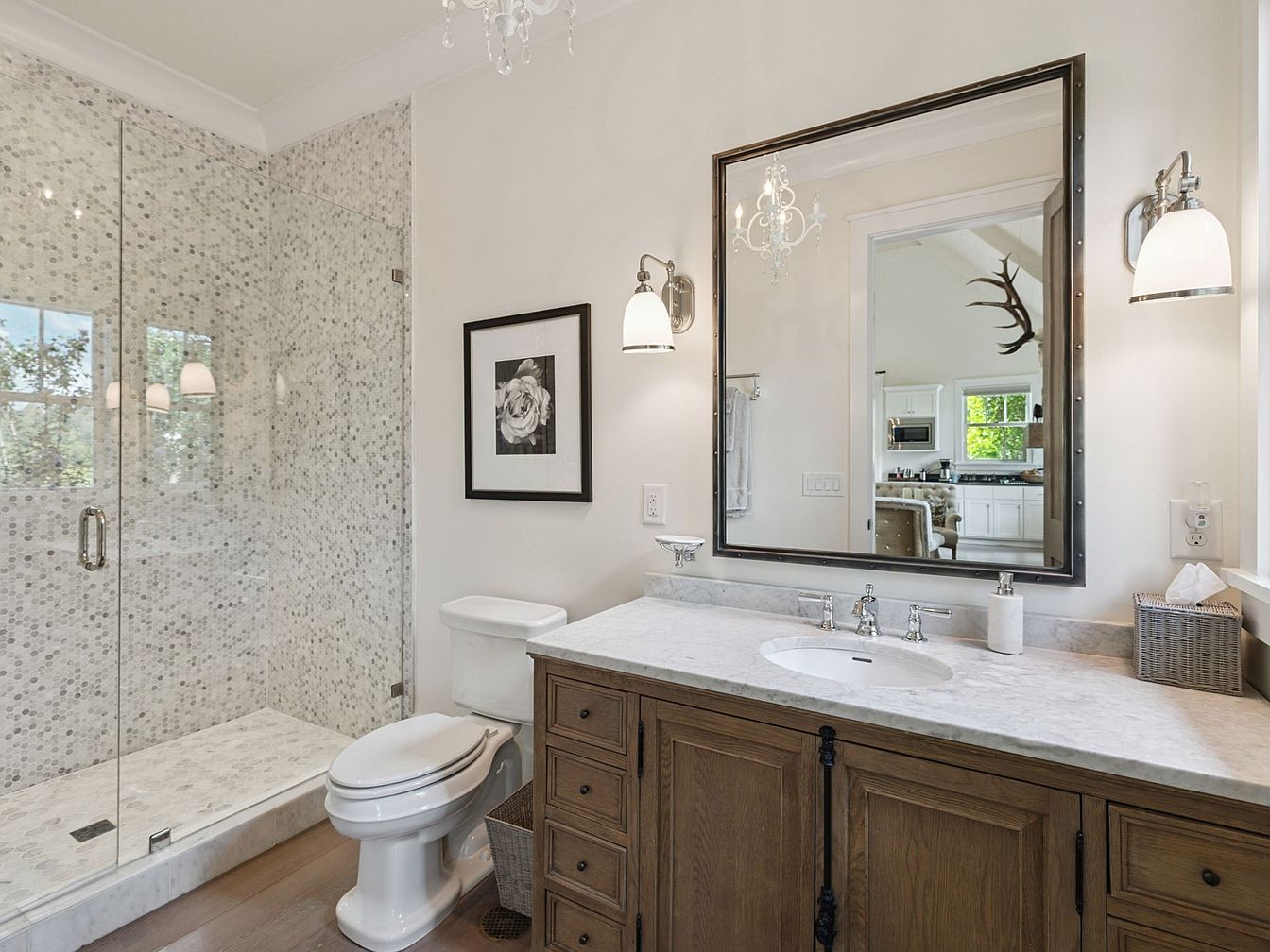 Spacious and bright, the bathroom features a wide wooden vanity with a marble countertop, set against clean off-white walls. A large mirror framed in dark metal hangs above the sink, flanked by two polished wall sconces emitting soft light. The generously sized, glass-enclosed walk-in shower stands to the right, with mosaic tilework in subtle gray and white tones for a fresh look. The traditional toilet sits conveniently between the vanity and the shower. Chic touches, such as a tissue box in a woven basket and folded towels, add hominess, making this a functional, inviting, and family-friendly space.